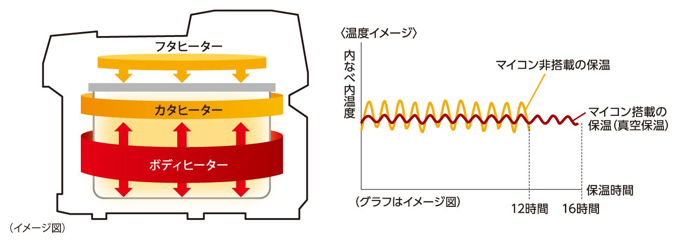 細かい温度制御で保温ムラを防ぐ「トリプルヒーター&マイコン保温」