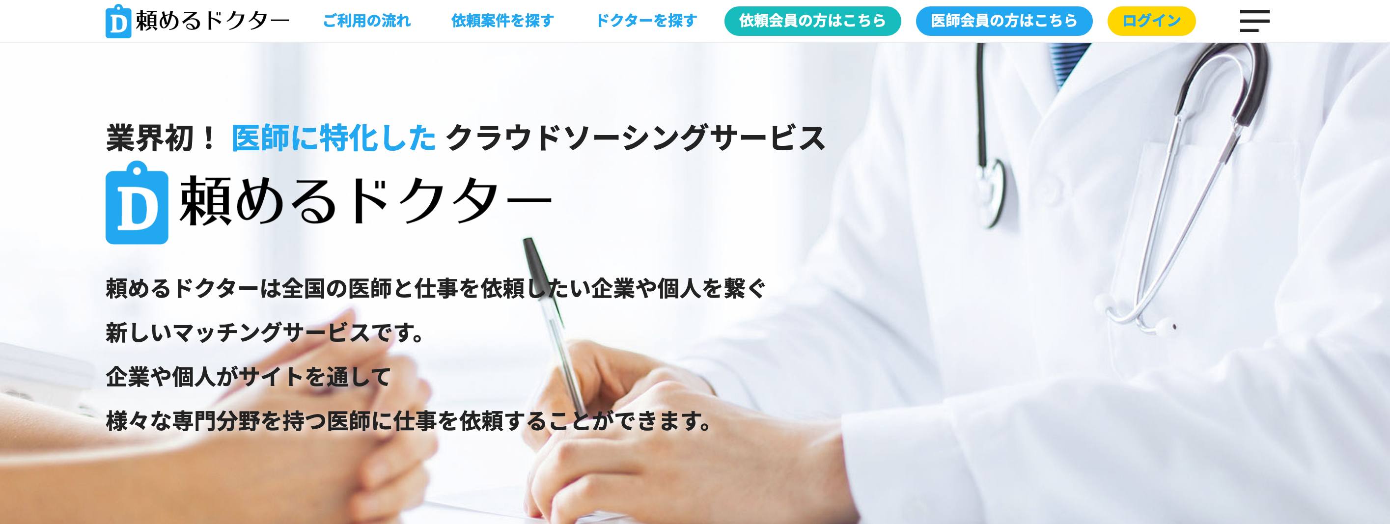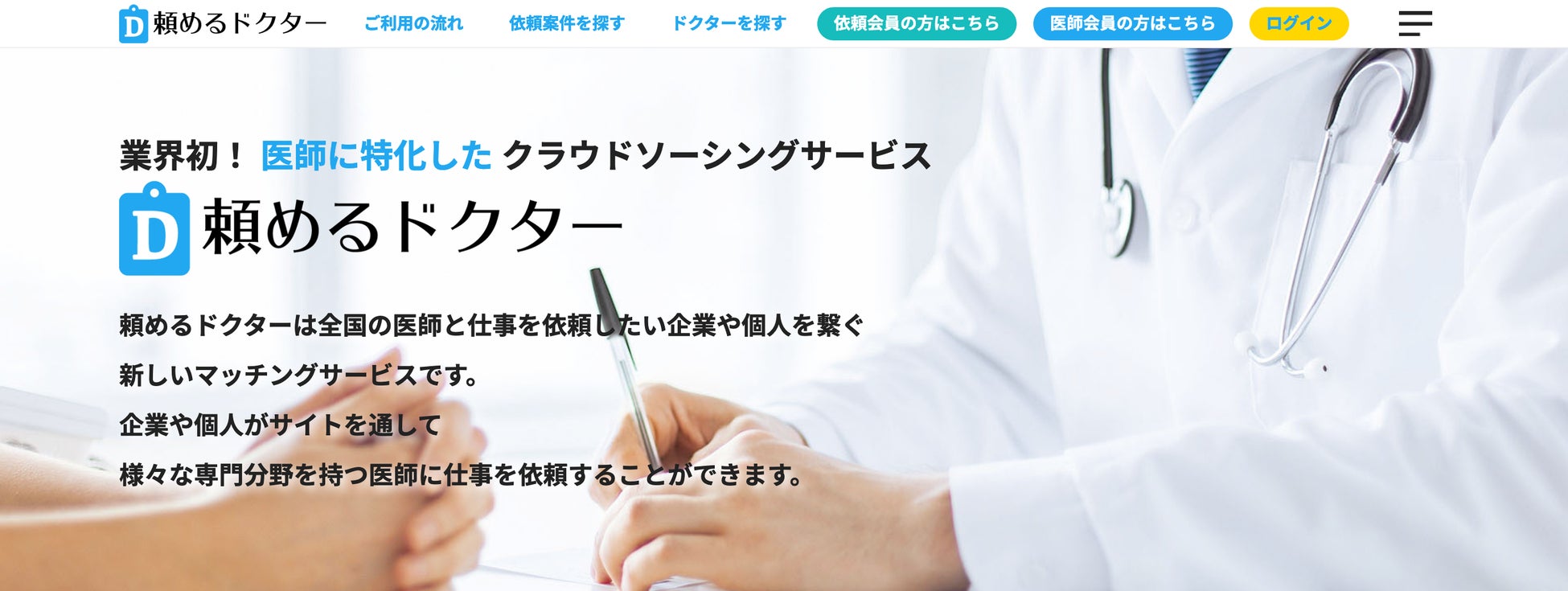 「頼めるドクター」は、全国の医師と仕事を依頼したい企業や個⼈を繋ぐマッチングサイトです。