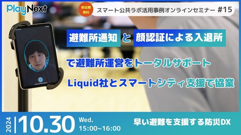 第15回スマート公共ラボ活用事例セミナー『住民への避難所通知と顔認証による入退所で避難所運営をトータルサポート~Liquid社とスマートシティ支援で協業~』をテーマに10月30日無料開催!