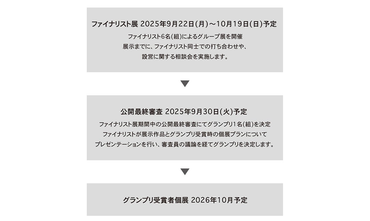 ※東京都、神奈川県、千葉県、埼玉県以外に在住の方には、日本国内移動分の往復交通費(公共交通機関の普通運賃)を別途お支払いしま す。(会場での打ち合わせ、ファイナリスト展設営、公開最終審査、ファイナリスト展撤去および事務局が要請したイベント登壇時。)応募フォーム に記載の住所が東京都、神奈川県、千葉県、埼玉県以外である必要があります。グループ応募の場合は代表者1名分のみ。