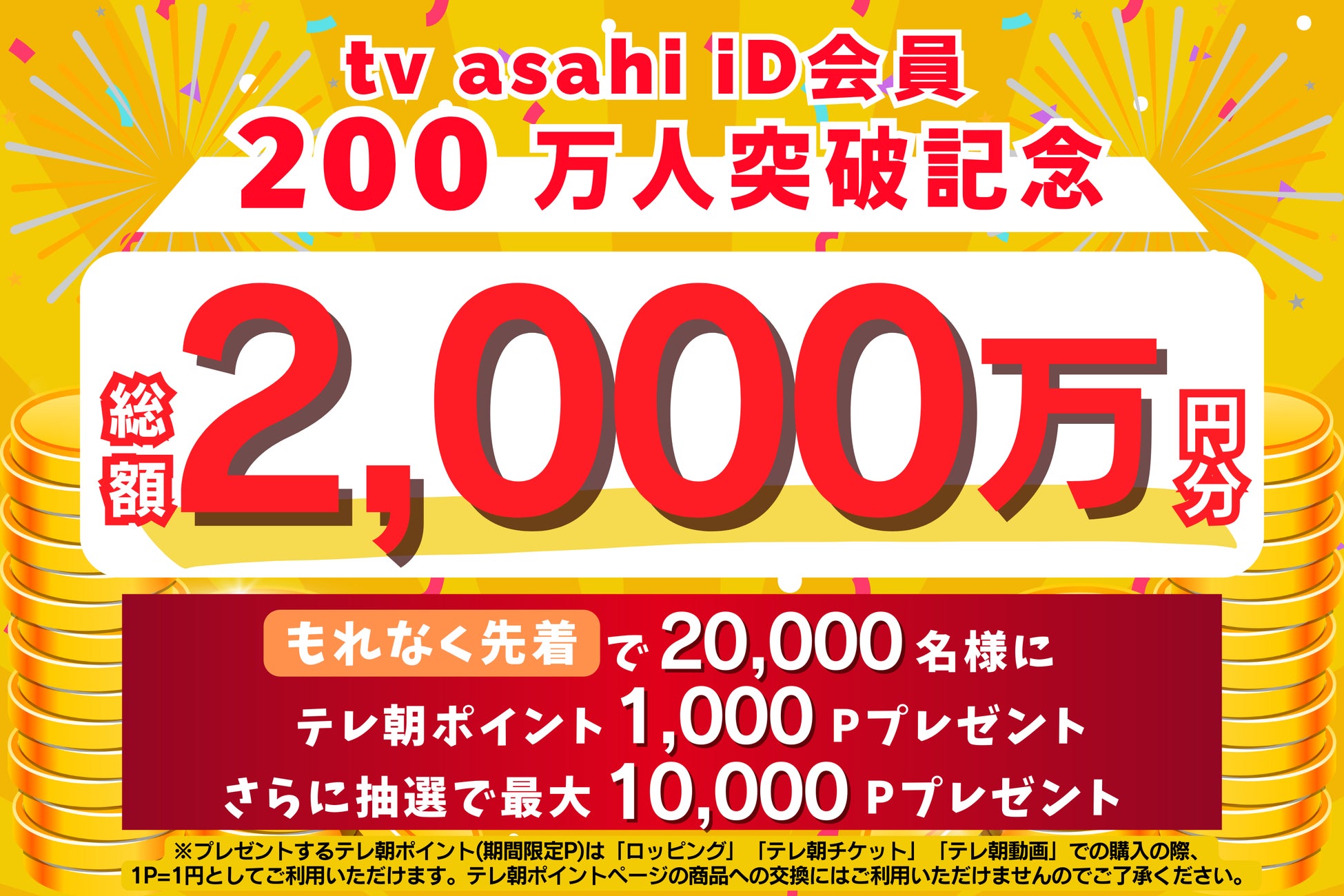 株式会社テレビ朝日(本社:東京都港区、代表取締役社長:篠塚 浩、以下 テレビ朝日)は、tv asahi iD会員200万人突破を記念し、総額2,000万円分の「テレ朝ポイント」プレゼントキャンペーンを2023年10月24日(火)17時より開始します。