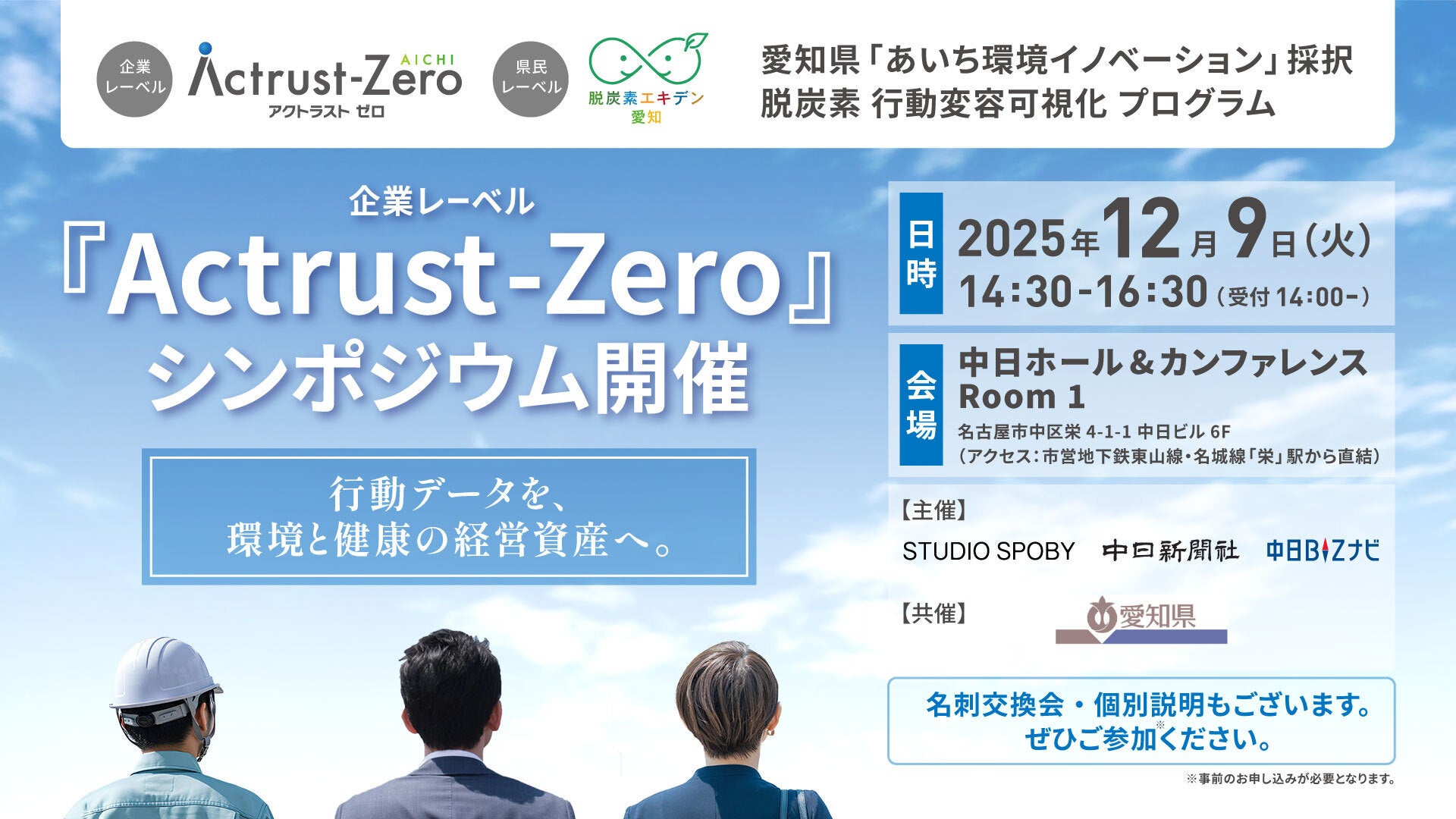 株式会社スタジオスポビー(本社:東京都渋谷区、代表取締役:夏目恭行)は、2025年12月9日(火)、中日ホール&カンファレンス(名古屋市栄)にて愛知県の「あいち環境イノベーション」採択プロダクトである行動変容アプリ「SPOBY(スポビー)」を基盤とした、「行動変容」を企業の脱炭素経営に直結させる企業レーベル『Actrust-Zero(アクトラスト・ゼロ)』シンポジウムを開催いたします。