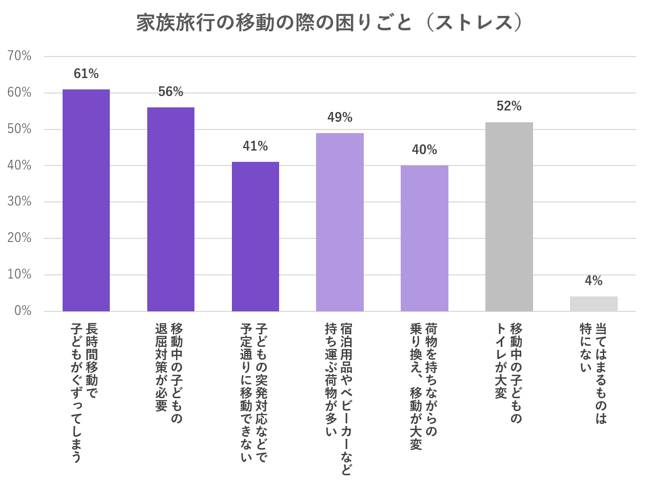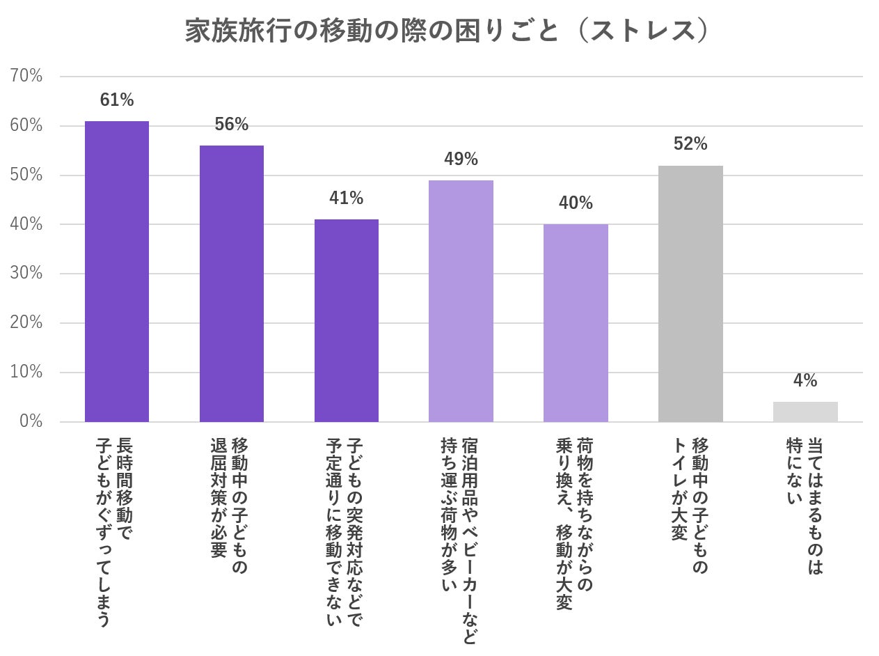 子どもや家族に関する様々な関心事やトレンド、体験活動やお出かけ市場などの調査レポート・分析データをコンテンツとして提供する情報メディア、いこーよ総研(いこーよ総合研究所)の2022年8月の調査によると、旅行での移動に関する困りごとにおいてもっとも多かったのは「長時間移動で子どもがぐずってしまう」、続いて「移動中の子どもの退屈対策が必要」などの”長時間移動におけるお子さまのケア”に関する課題と、「運ぶ荷物が多い」や「荷物を持ちながらの移動が大変」などの”荷物の持ち運び”に関する課題の2つが挙げられます。