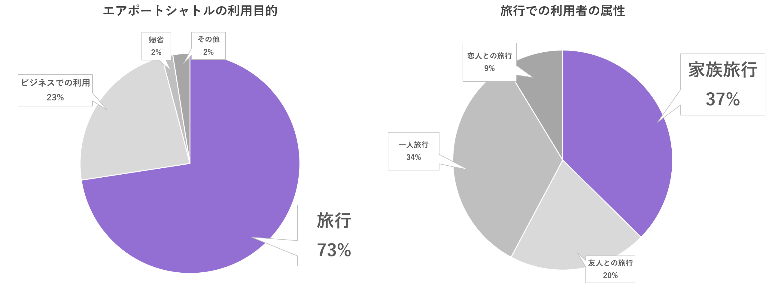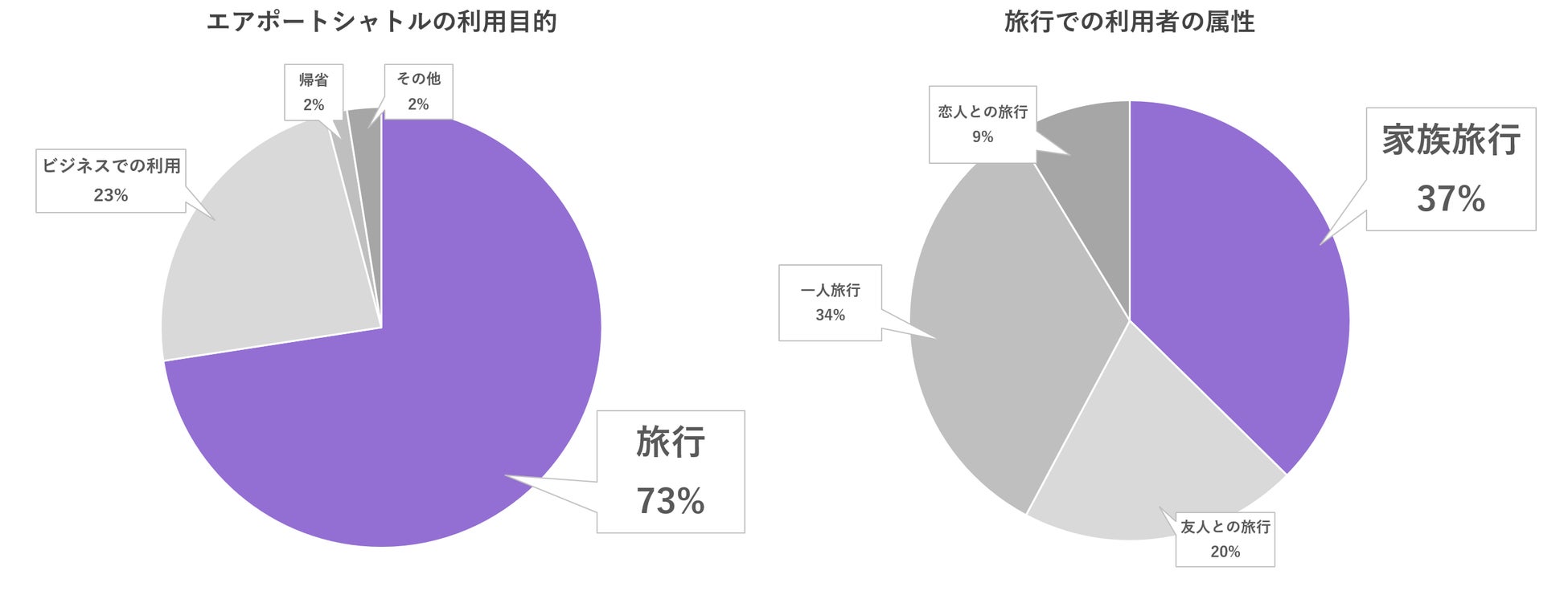 エアポートシャトルは出張等のビジネスや、帰省などさまざまな目的で利用されていますが、ユーザーの内、7割以上が旅行での空港までの移動にエアポートシャトルを利用しており、さらに、旅行で利用しているユーザーの内、約4割は家族旅行となっています。