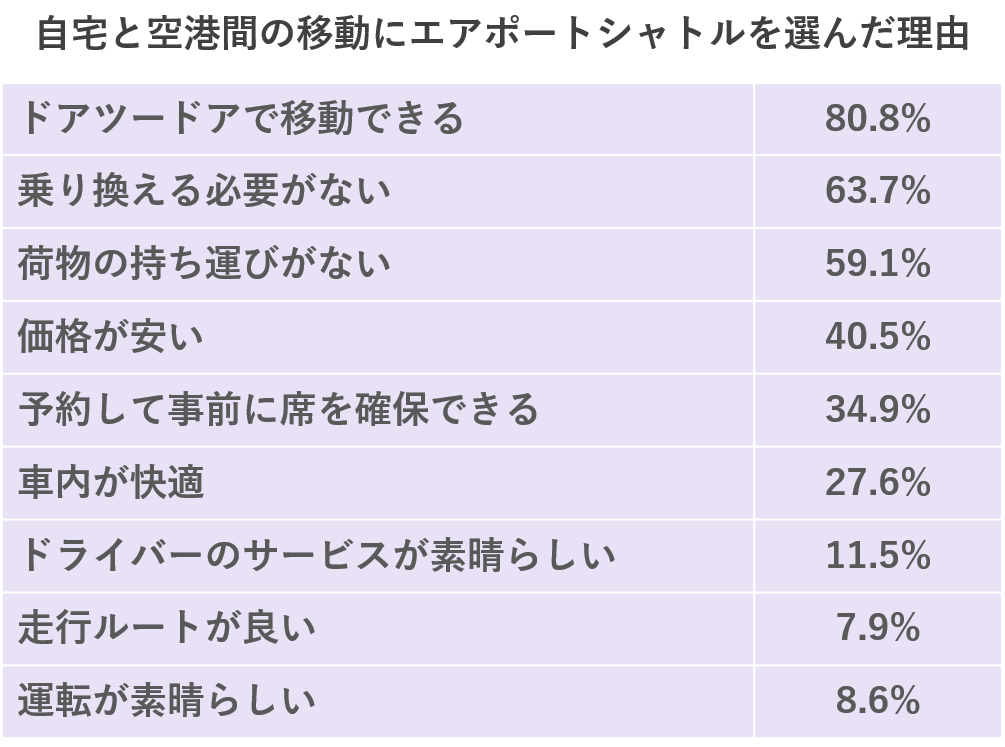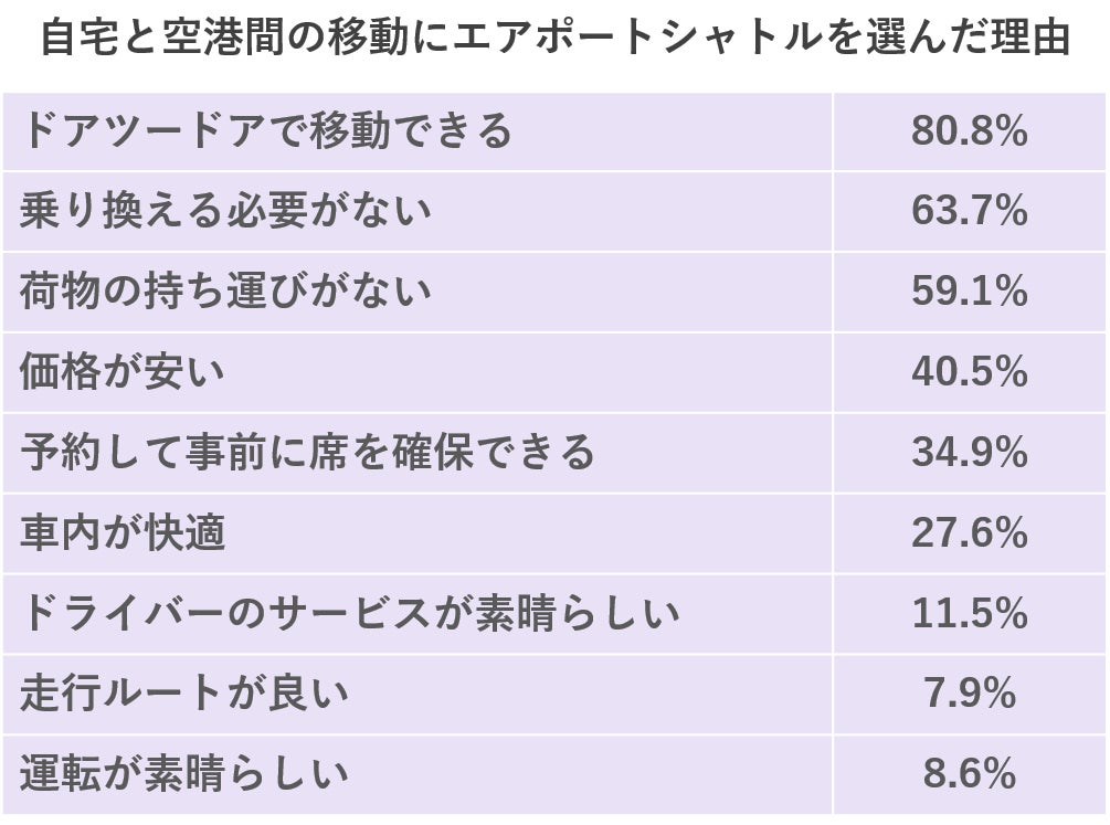 エアポートシャトルの利用者が自宅と空港間の移動においてエアポートシャトルを選んだ理由として「ドアツードアで移動できる」や、「荷物の持ち運びがない」「価格が安い」。また、「車内が快適」であることが挙げられています。