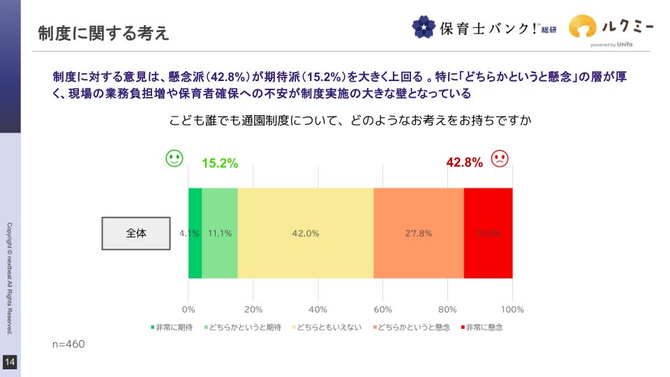「こども誰でも通園制度」に対する意見は「懸念派」(42.8%)が「期待派」(15.2%)を大きく上回る結果に。