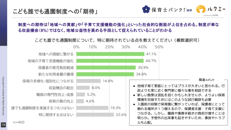 一方、「地域への貢献」(41.1%)や「地域の子育て支援機能の強化」(40.7%)など、制度の社会的な意義に対する期待は高い。