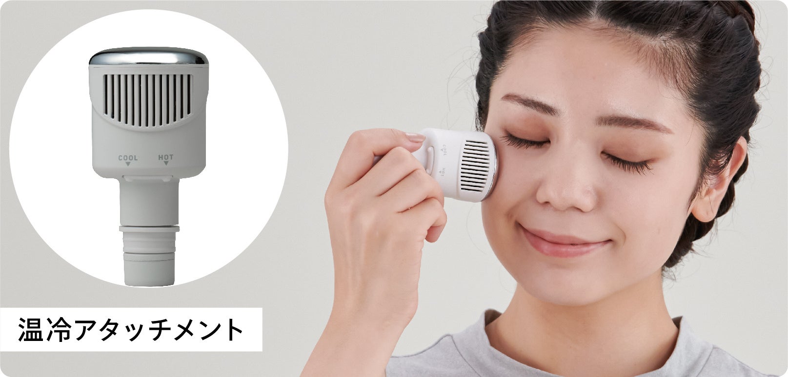温冷アタッチメントは取り外して、フェイスケアにも使えます。ホットモードは目もとや首、クールモードはお肌のひきしめとしておすすめです。