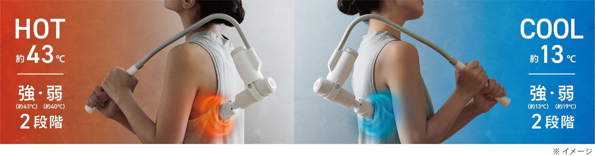 新機能として速暖・速冷機能を追加し、2つのモードを切り替えて使用できます。ホットモード・クールモードそれぞれ2段階の温度調節が可能です。ヘッド部には、熱伝導率の良い合金を使用し、素早く温度を身体に伝えます。