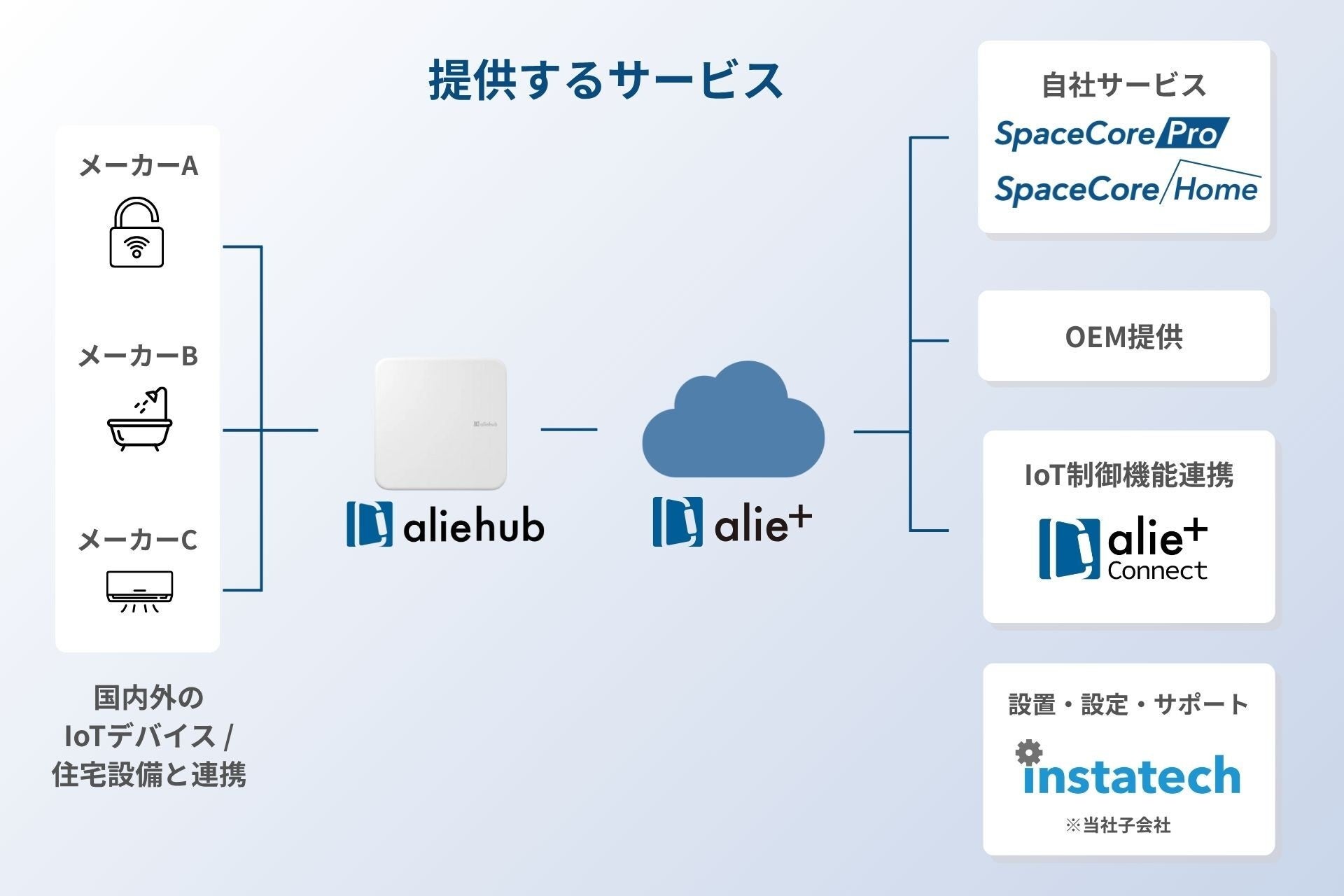 自社開発のIoTプラットフォーム「alie+(アリープラス)」をベースにスマートホームプロダクト「SpaceCore(スペースコア)」を提供 しています。また、alie+Connectを通じ、様々な業界に当社のIoTを提供しています。