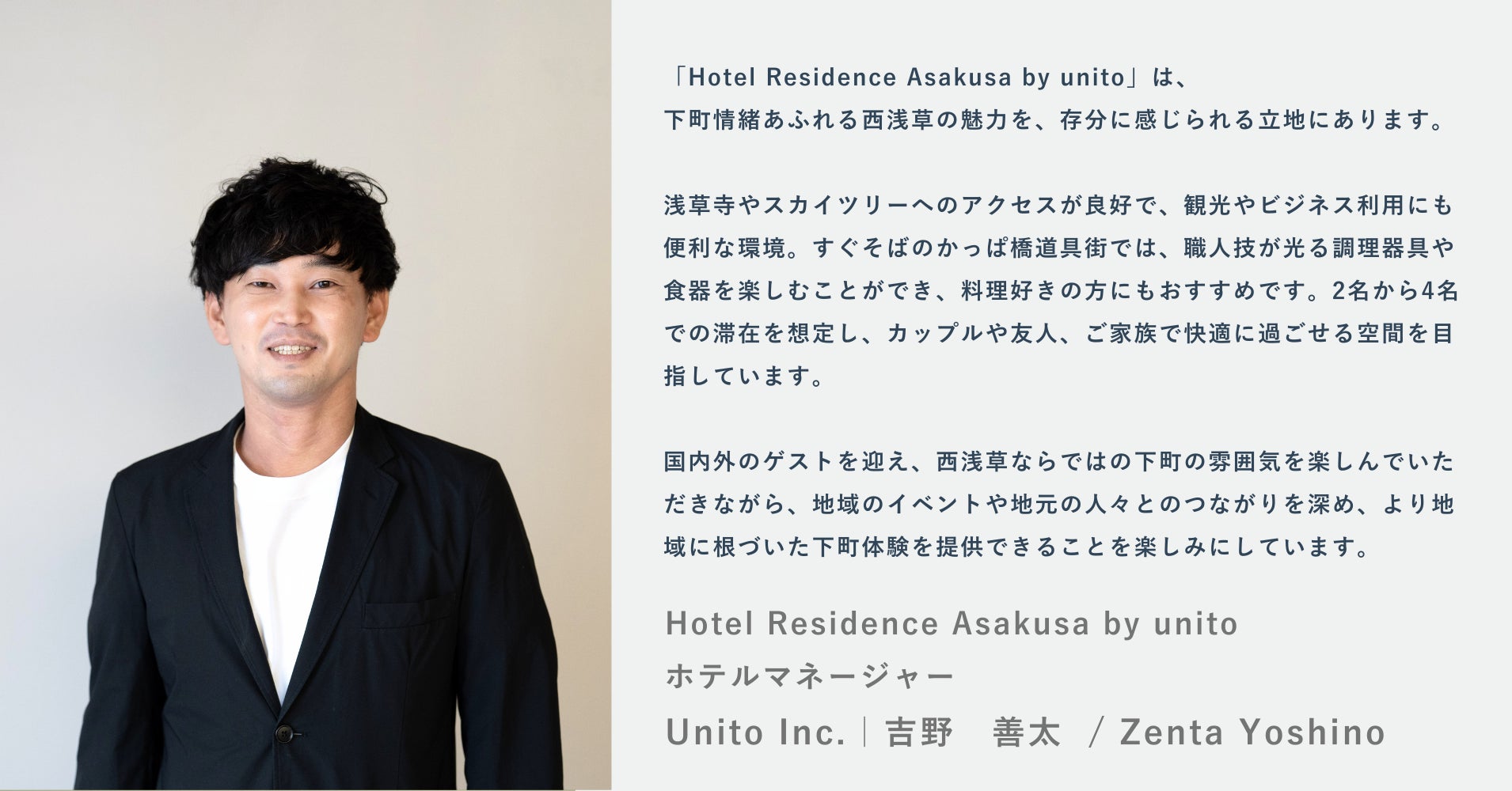 株式会社Unito(本社:東京都目黒区、代表取締役:近藤佑太朗、読み:ユニット、以下「Unito」)は、2025年4月2日にジェイレックス・コーポレーション株式会社(本社:東京都新宿区、代表取締役:春田 英樹、以下「ジェイレックス・コーポレーション」)とともに、ホステルスタイルのホテルレジデンス「Hotel Residence Asakusa by unito」(所在地:東京都台東区、以下「Hotel Residence Asakusa」)を2025年4月1日より開業します。