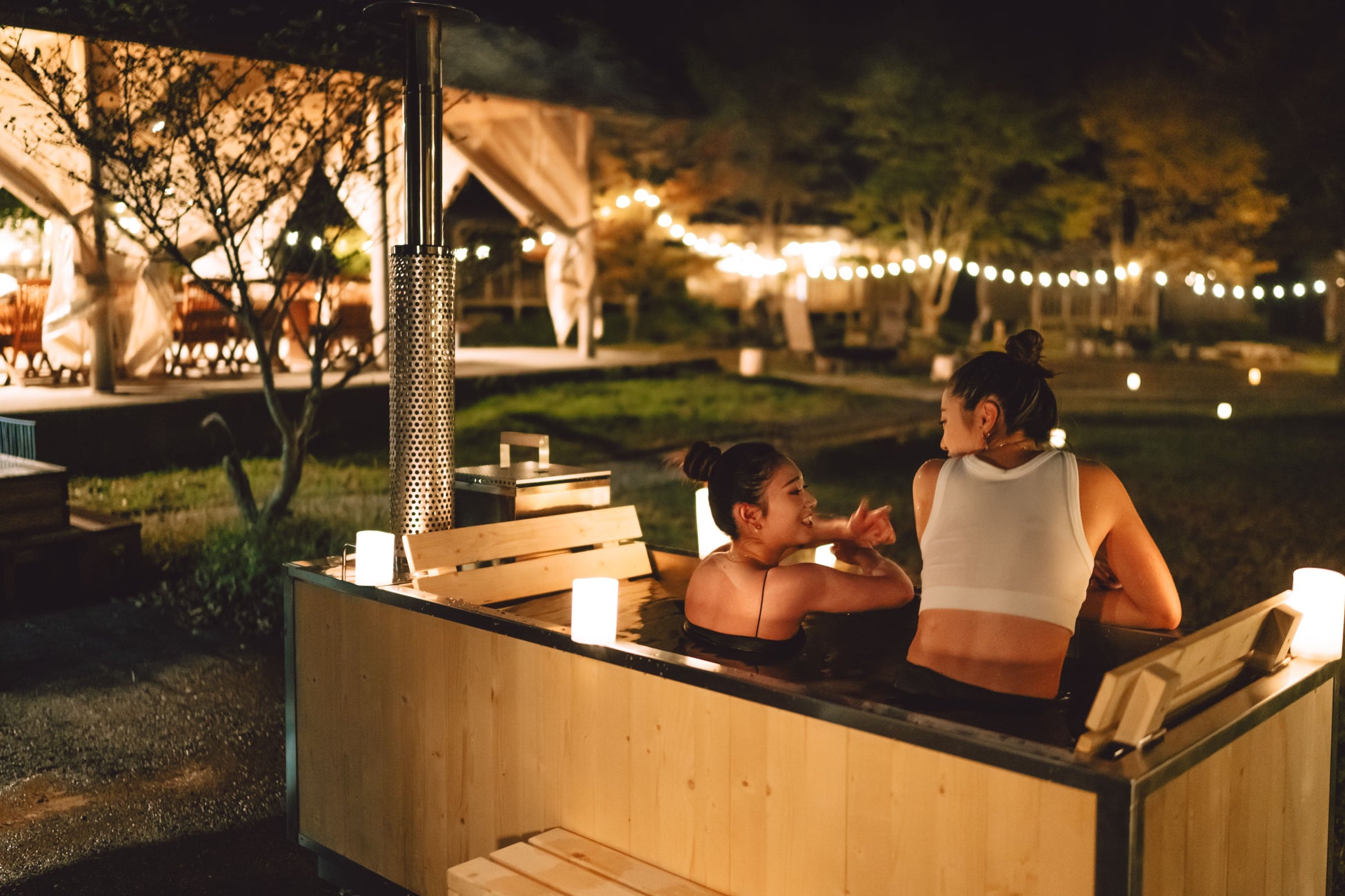 今秋から、日中だけでなく夜でもテントサウナを楽しめる「ナイトテントサウナ」を導入。世界一の高温テントサウナと称される「MORZH」で、贅沢なサウナ体験をお楽しみいただけます。完全プライベート空間で男女一緒にお楽しみいただけるので、カップルの方からも好評のお声をいただいております。