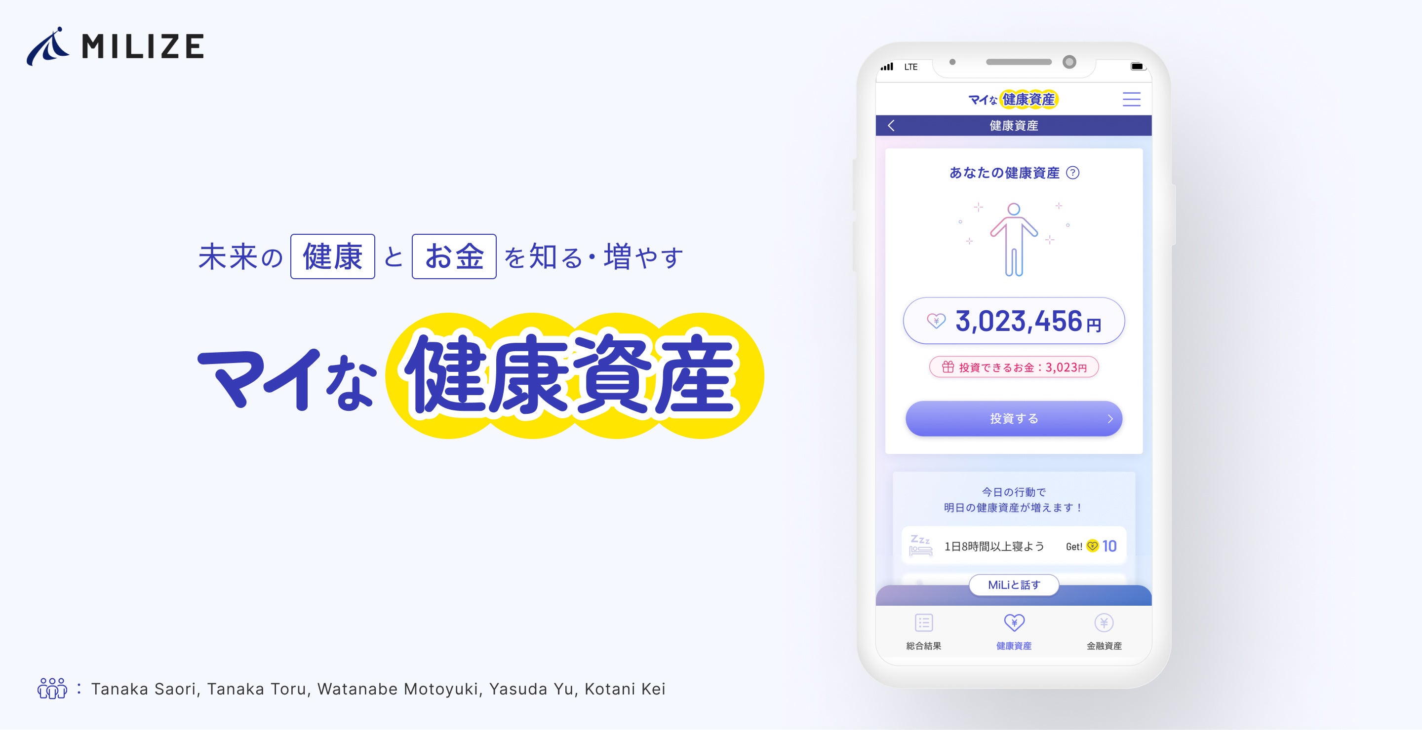 マイナポータルAPIと連携をすることで、健康診断で得られる特定健診情報や所得・年金給付の情報等を元にして、今後どのような健康状態になるか将来の健康価値を健康資産と定義し、金融資産とともに試算する。規則正しい生活を送ると健康資産は増えていき、貯まった健康資産を投資にまわすことができる。このアプリの利用により、健康を加味した老後2,000万円問題解決が期待できる。