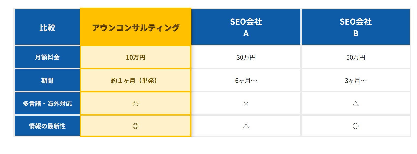 【サービス内容の他社比較】 (アウンコンサルティング調べ)