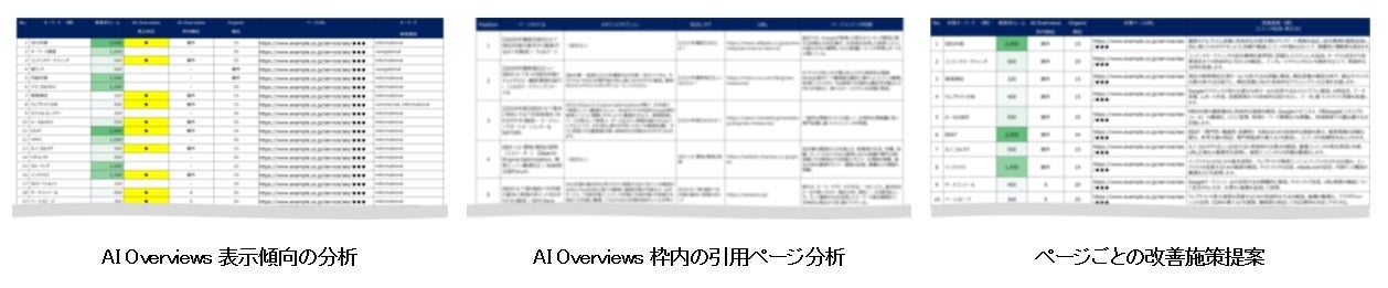 各ページについて、AI Overviews 枠内への表示や、枠内への安定した表示のためのコンテンツ設定などの改善施策をご提案いたします。 -