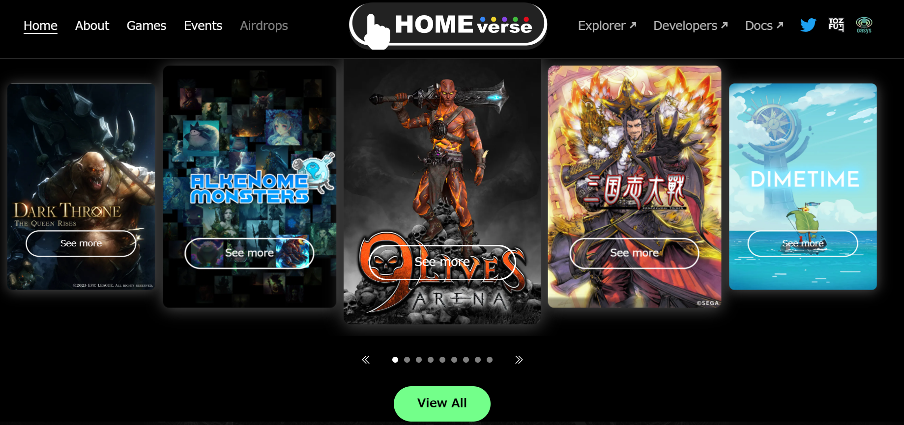 HOME Verseは、double jump.tokyo株式会社が開発・運用をする、ゲーム特化型ブロックチェーン"Oasys"から認定されたVerseです。ユーザーは高速、ガス代無料で幅広いジャンルのブロックチェーンゲームを遊ぶことができます。コンセプトフリーを特徴としており、大手ゲーム事業者からインディーゲーム開発者まで対応することが可能です。現在9タイトルが参画を発表しており、今後もエコシステムを拡大していきます。