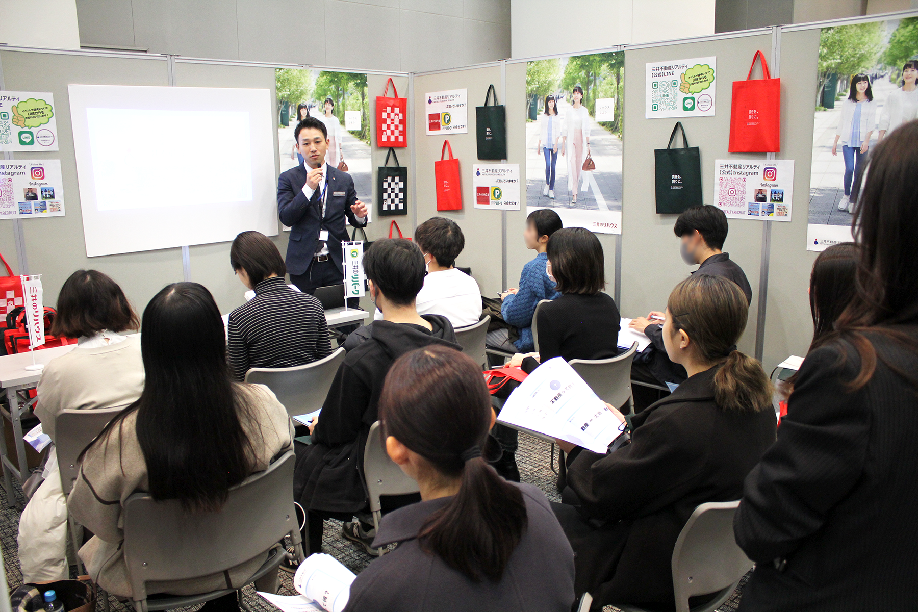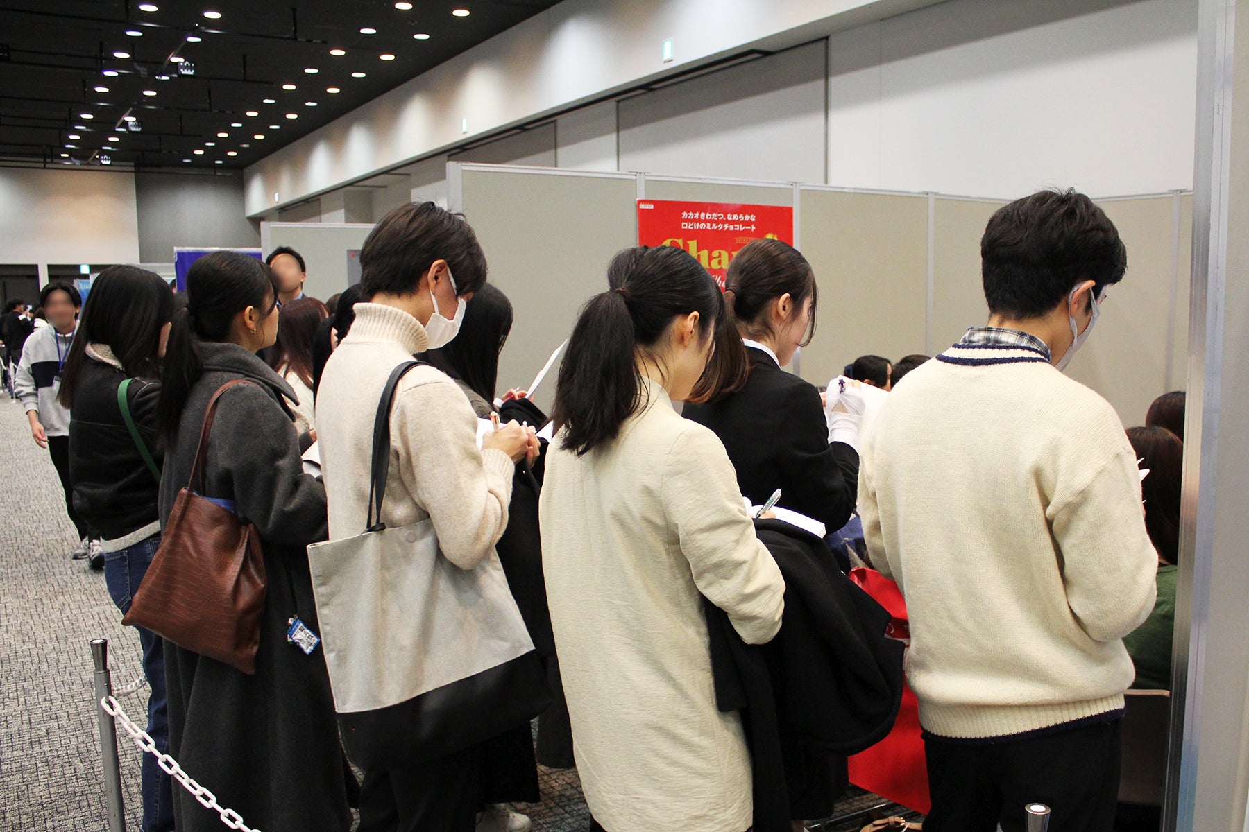 イベント開始前から会場には私服に身を包んだ多くの学生が来場しました。学生たちは開始と同時に興味のあるブースへと移動し、企業の説明に熱心に耳を傾けたり、質問をしたりしていました。私服で訪れた学生たちと接した出展企業の採用担当者は、「(学生たちは)固くならずリラックスした様子だった」と述べるなど、スーツの時よりも肩の力が抜けている様子がうかがえました。
