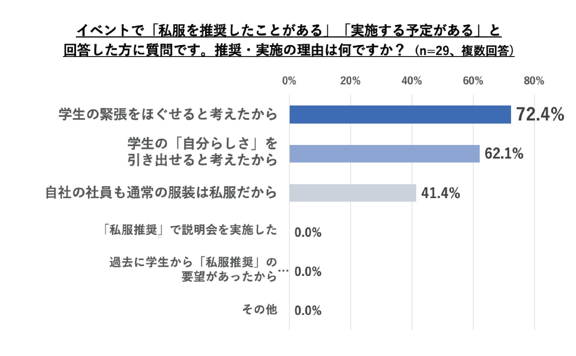 「私服推奨」とした理由のトップは、「学生の緊張をほぐせると考えたから」(72.4%)で、次いで「学生の“自分らしさ”を引き出せると考えたから」(62.1%)となりました。企業の人事・採用担当者が、いかにして学生の良さを引き出せるかを考えて採用活動に取り組んでいるかが感じられます。
