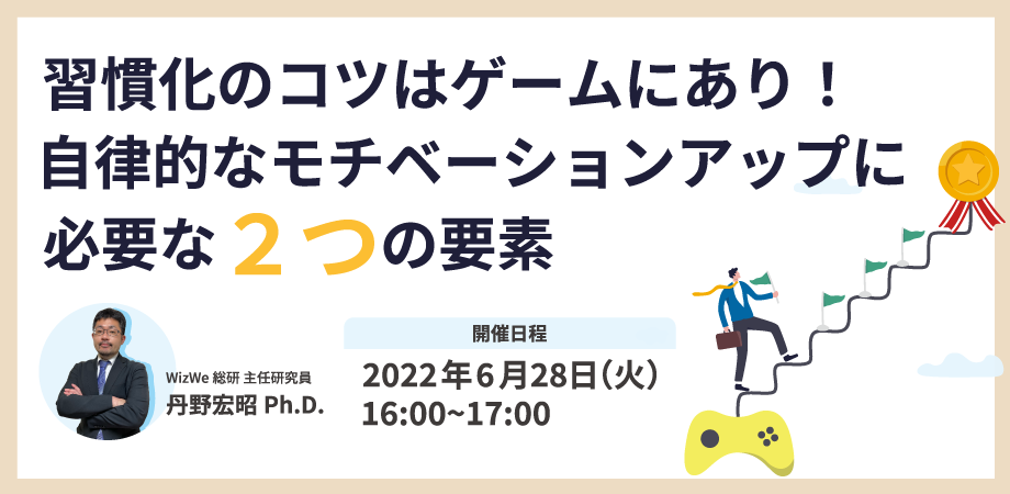 この度、習慣化プラットフォームを開発・運営する株式会社WizWe(ウィズウィー、所在:東京都千代田区、代表取締役CEO:森谷 幸平、以下「WizWe」)は、WizWe総研 主任研究員 丹野宏昭Ph.D.によるセミナー「習慣化のコツはゲームにあり!自律的なモチベーションアップに必要な2つの要素」を、2022年6月28日(火)に開催いたします。