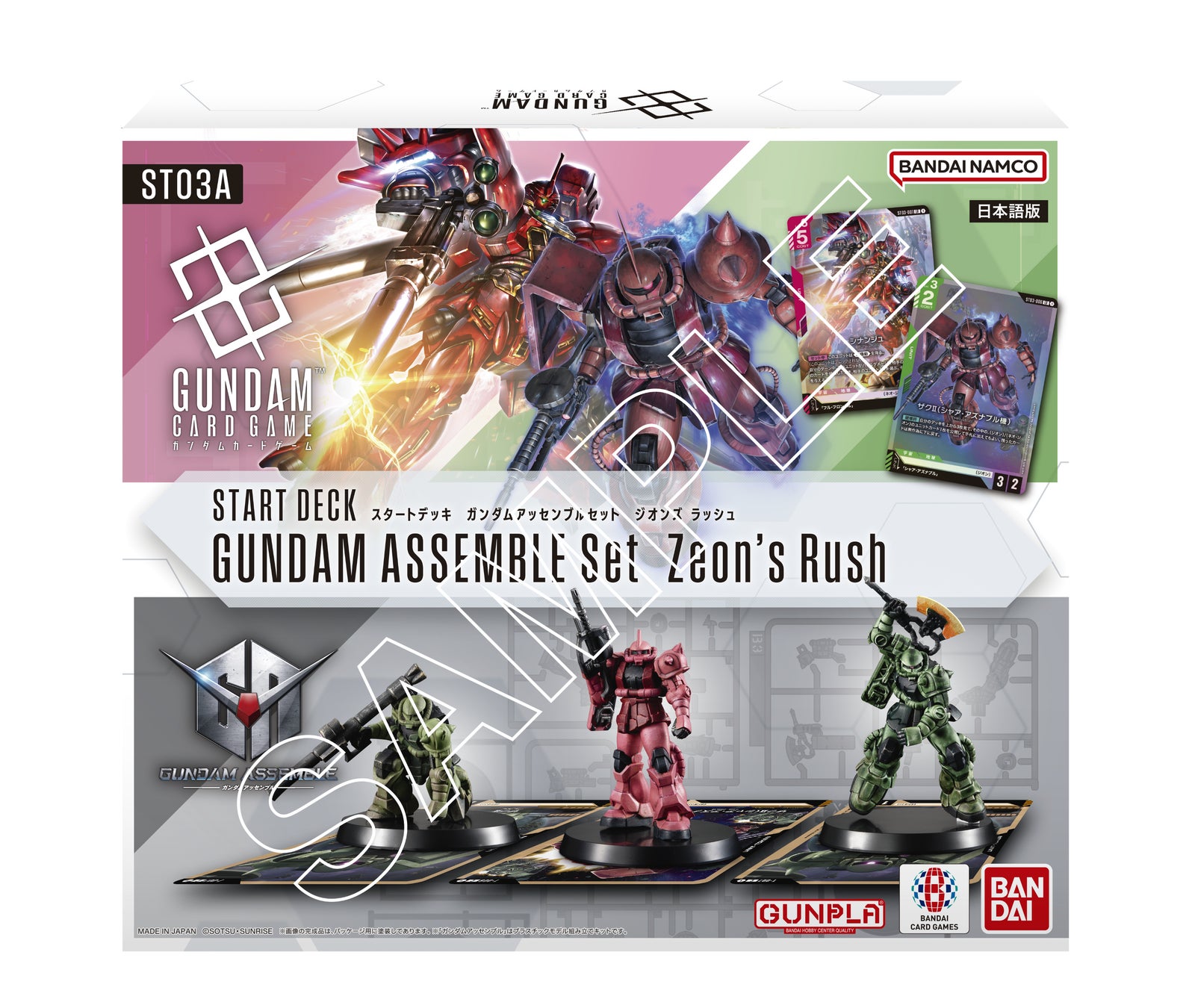 『ガンダムカードゲーム』のプレイ時にトークンカードの上に置いて遊ぶことができるミニチュアサイズのガンプラ『GUNDAM ASSEMBLE(ガンダムアッセンブル)』を同梱した特別版スタートデッキも7月12日(土)に同時発売いたします。それぞれのデッキに収録するトークンカードに対応した『GUNDAM ASSEMBLE(ガンダムアッセンブル)』を手に入れることが出来ます。『GUNDAM ASSEMBLE(ガンダムアッセンブル)』をトークンカードの上に置いてプレイすることにより、臨場感を増したバトルを再現することができます。