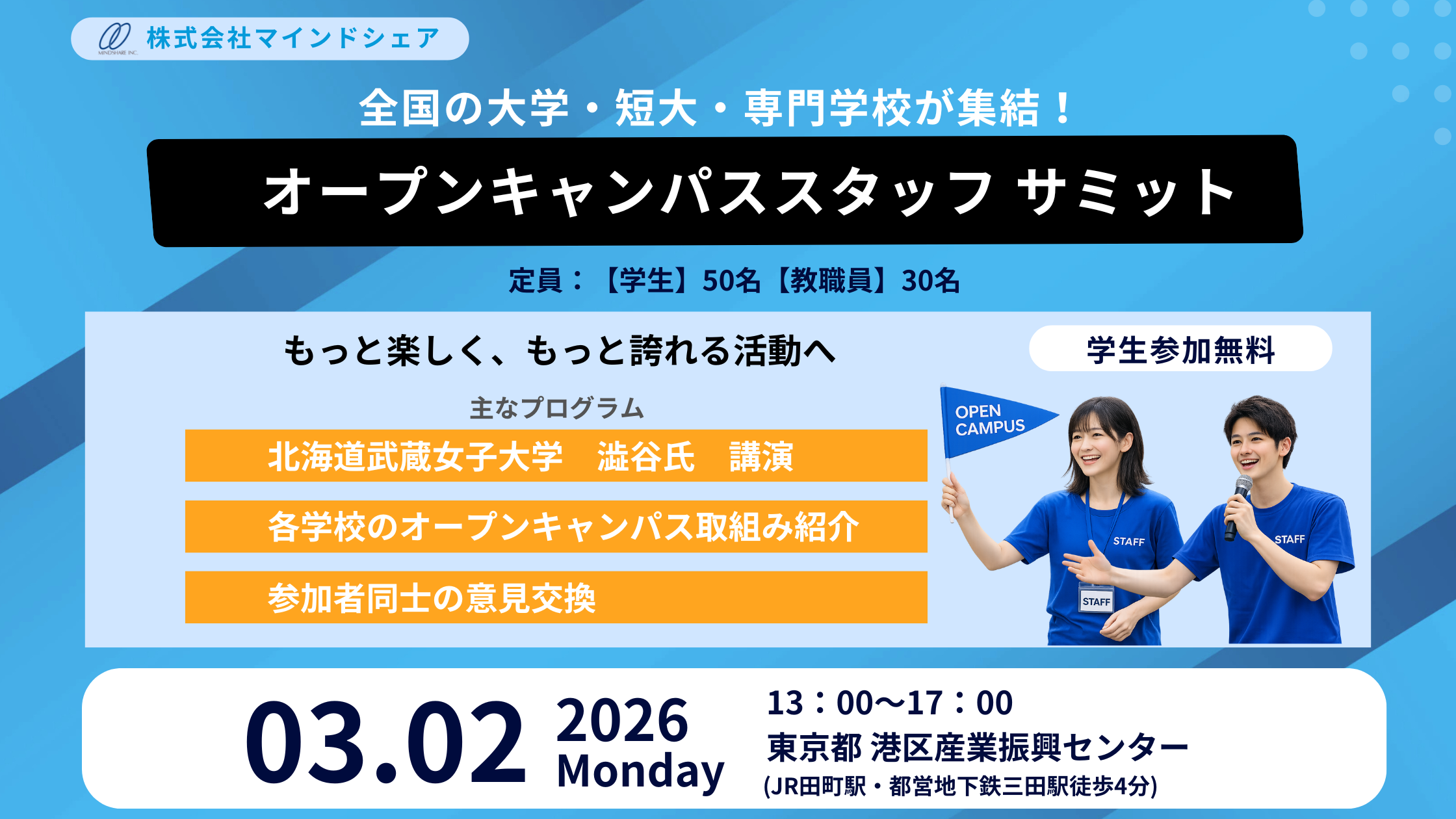 これまでの活動を通じて見えてきた課題意識を背景に、全国の大学・短期大学・専門学校でオープンキャンパス運営に携わる学生スタッフを対象とした対面型イベント「第1回オープンキャンパススタッフサミット」を、2026年3月2日(月)に開催いたします。