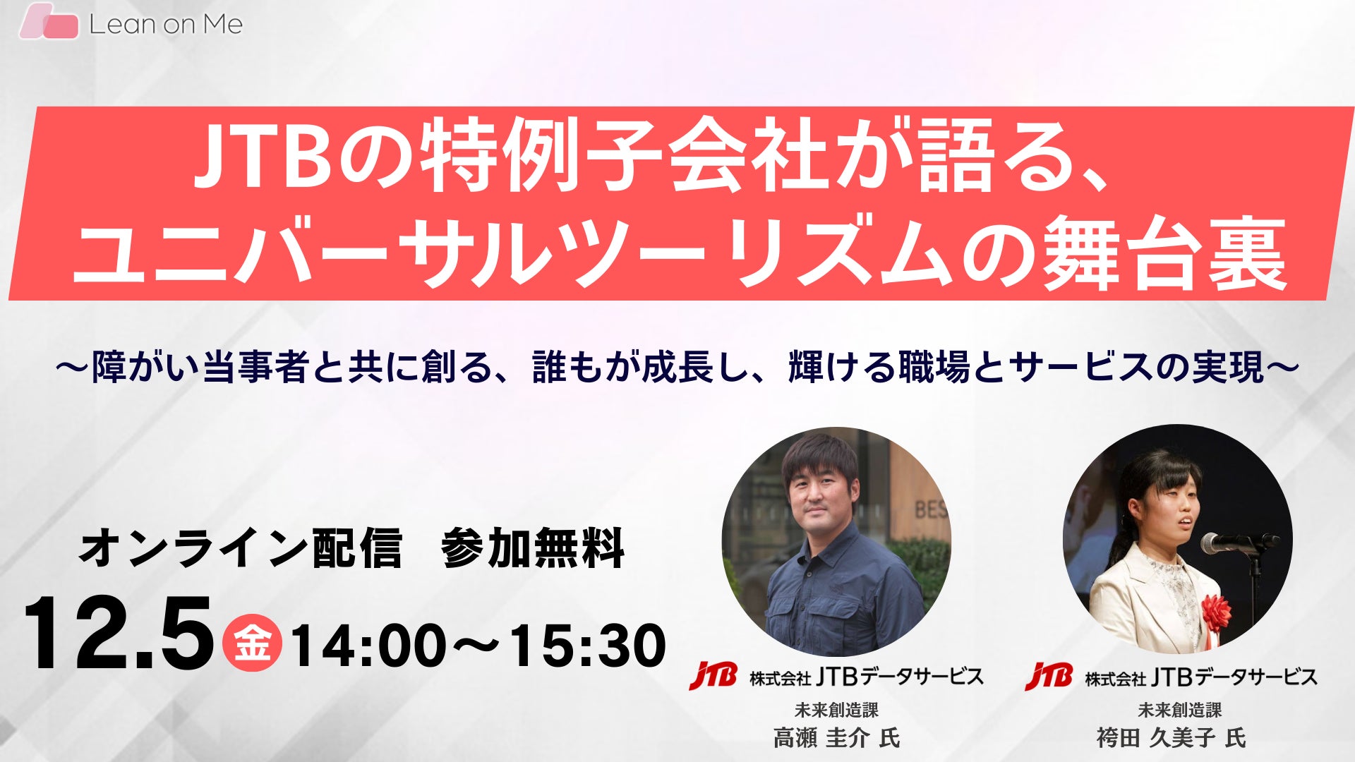 インクルTech※(インクルテック)で社会課題を解決するスタートアップ企業・株式会社Lean on Me(本社:大阪府高槻市、代表取締役:志村駿介、以下「リーンオンミー」)は、ホテル・テーマパークなど観光業界の経営者やダイバーシティ推進担当者を対象としたセミナー「JTBの特例子会社が語る、ユニバーサルツーリズムの舞台裏~障がい当事者と共に創る、誰もが成長し、輝ける職場とサービスの実現~」を12月5日にオンラインで無料開催いたします。