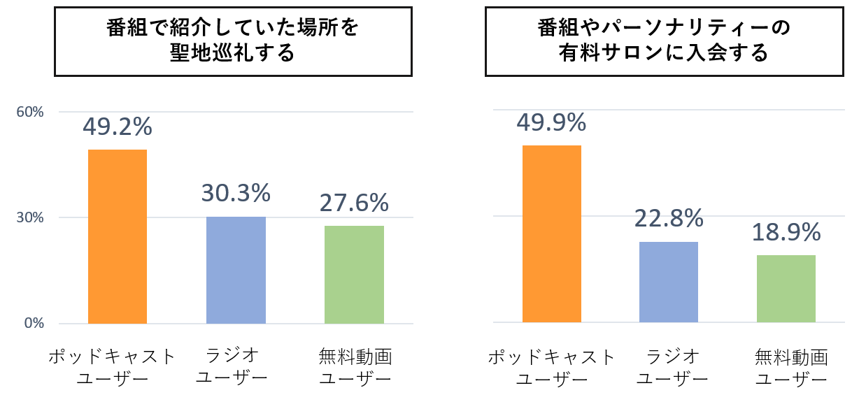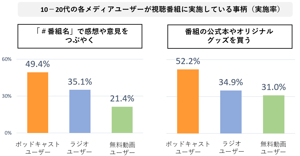 ③10-20代のポッドキャストユーザーの約半数が、番組を聴くだけでなく「#番組名でつぶやく」のはもちろん、「番組の公式本やオリジナルグッズを買う」「番組のイベントに参加する」「番組やパーソナリティの有料サロンに入会する」など番組関連の消費にも積極的で、強いエンゲージメント力を有していることが明らかになった。