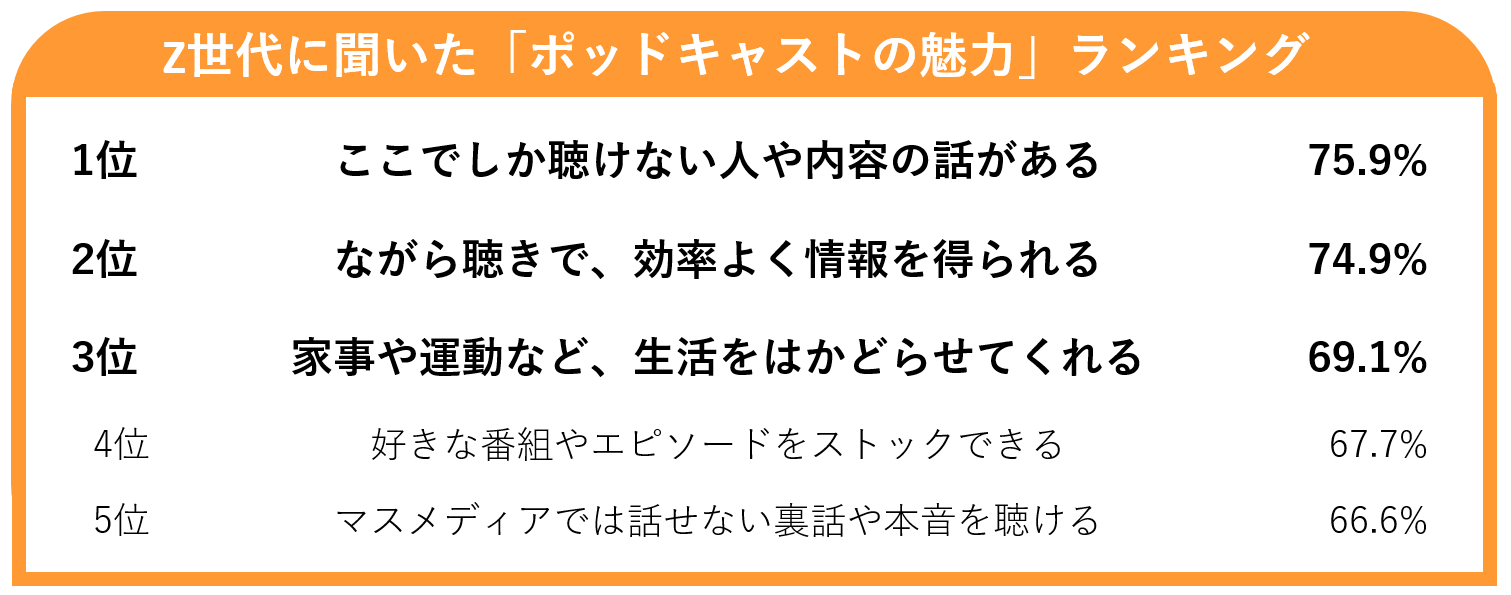 2位は「ながら聴きで、効率よく情報を得られる」、3位「家事や運動など、生活をはかどらせてくれる」と音声の魅力があがる。5位には、1位のポッドキャストの独自性に関連して「マスメディアでは話せない裏話や本音を聴ける」があがる。