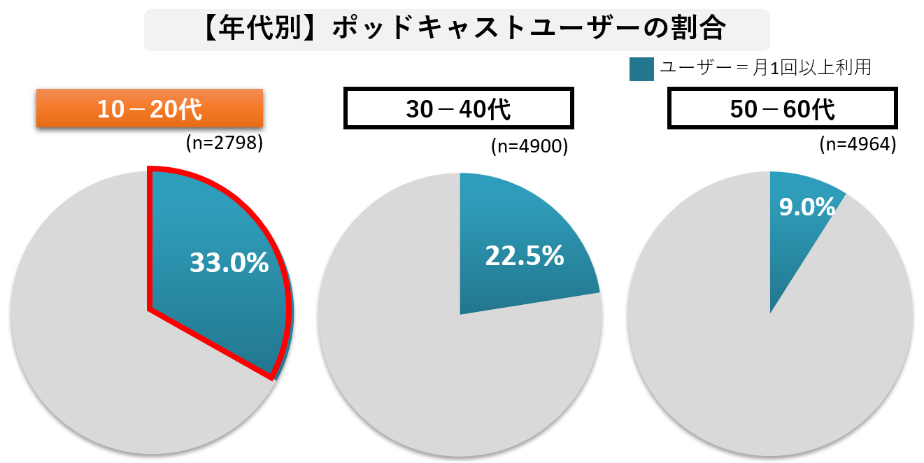 ①ポッドキャストユーザー(月1回以上聴取)は、10-60代で19.5%。