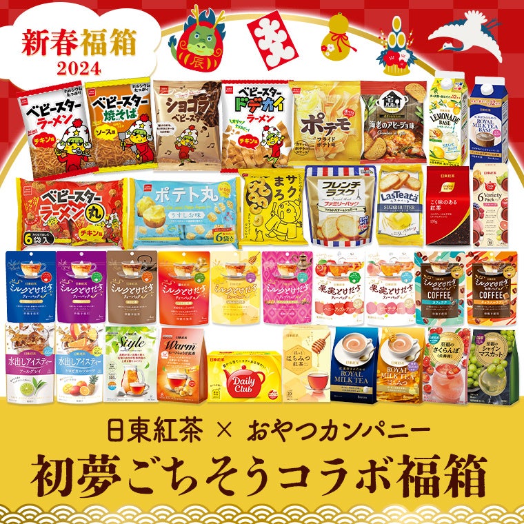 毎年、公式オンラインショップ日東紅茶TeaMartで販売している企画品「新春福箱」。SNSでも話題の大人気商品です。3回目となる今年は、ベビースターラーメンでおなじみ、あの『おやつカンパニー』とのコラボで販売いたします。