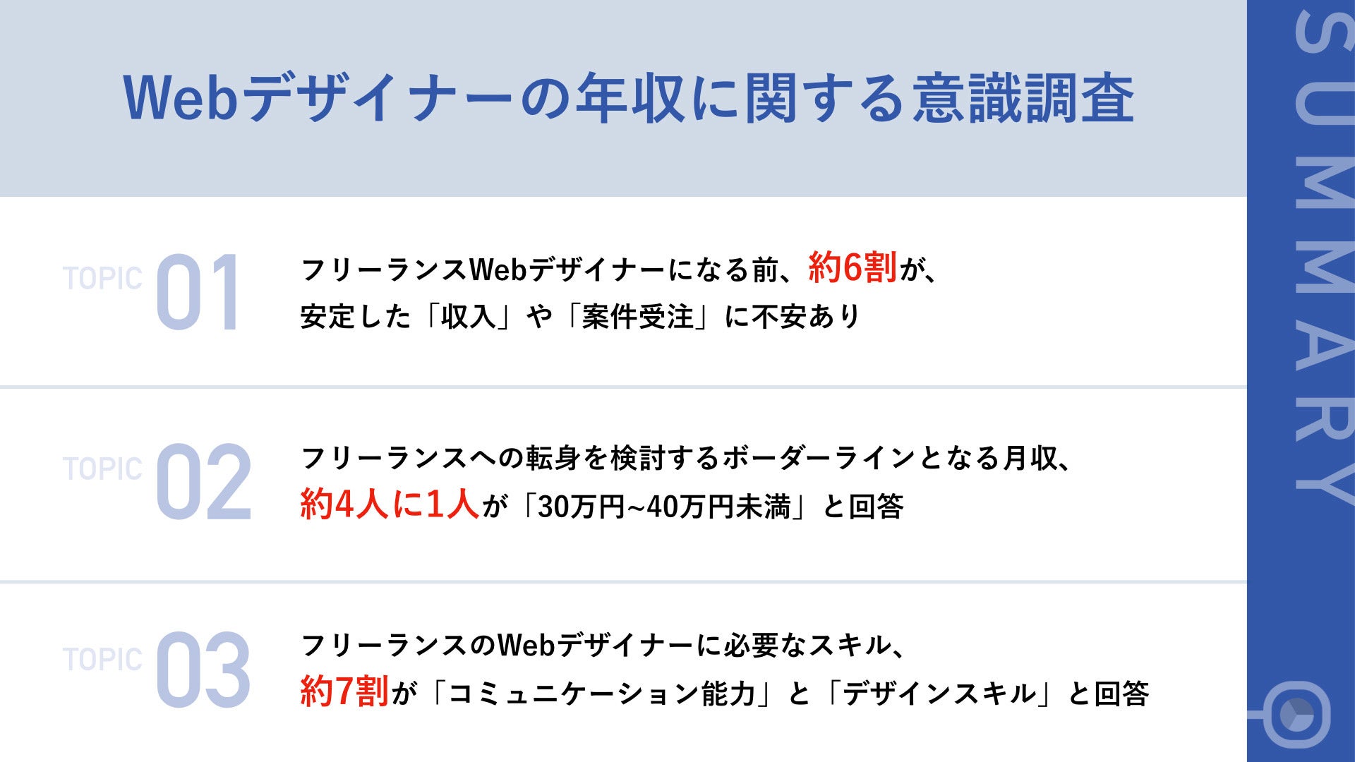 今回の調査では、フリーランス、個人事業主のWebデザイナーは自身の転身前は「収入」や「案件受注」に不安を抱えており、見込み月収30万円を一つの基準としてフリーランスへの転身を検討することが明らかとなりました。安定した収入を得るためには安定した案件受注が必要となるため、デザインスキルだけではなく集客術や受注スキルも必要とされます。これらすべてのノウハウ、スキルを身に着け実践できるかどうかがフリーランスWebデザイナーとして成功するための鍵と言えそうです。