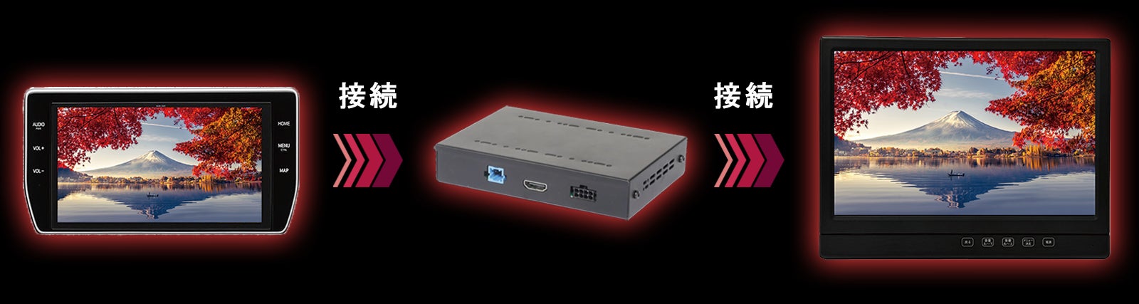 トヨタ車の純正ナビの映像信号を直接変換することで、画質を保ったままリアモニターへの出力を可能にします。