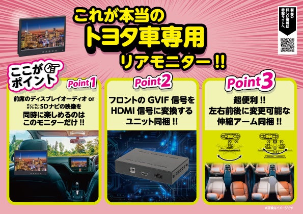 トヨタ車専用リアモニターの決定版!発売開始! 独自開発のGVIF変換ユニットで純正フロントディスプレイの映像コンテンツを後席で同時視聴! 伸縮アーム搭載モニターで車内を最強エンタメ空間に!