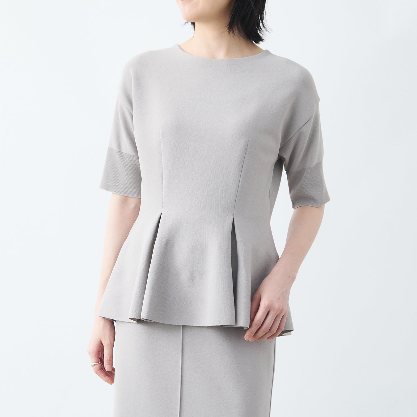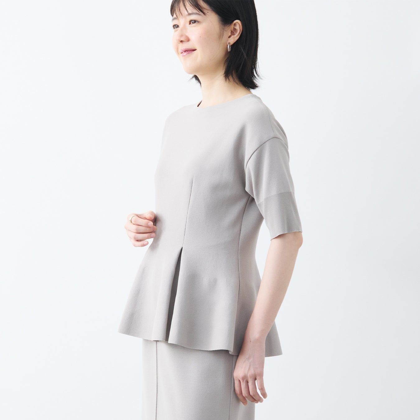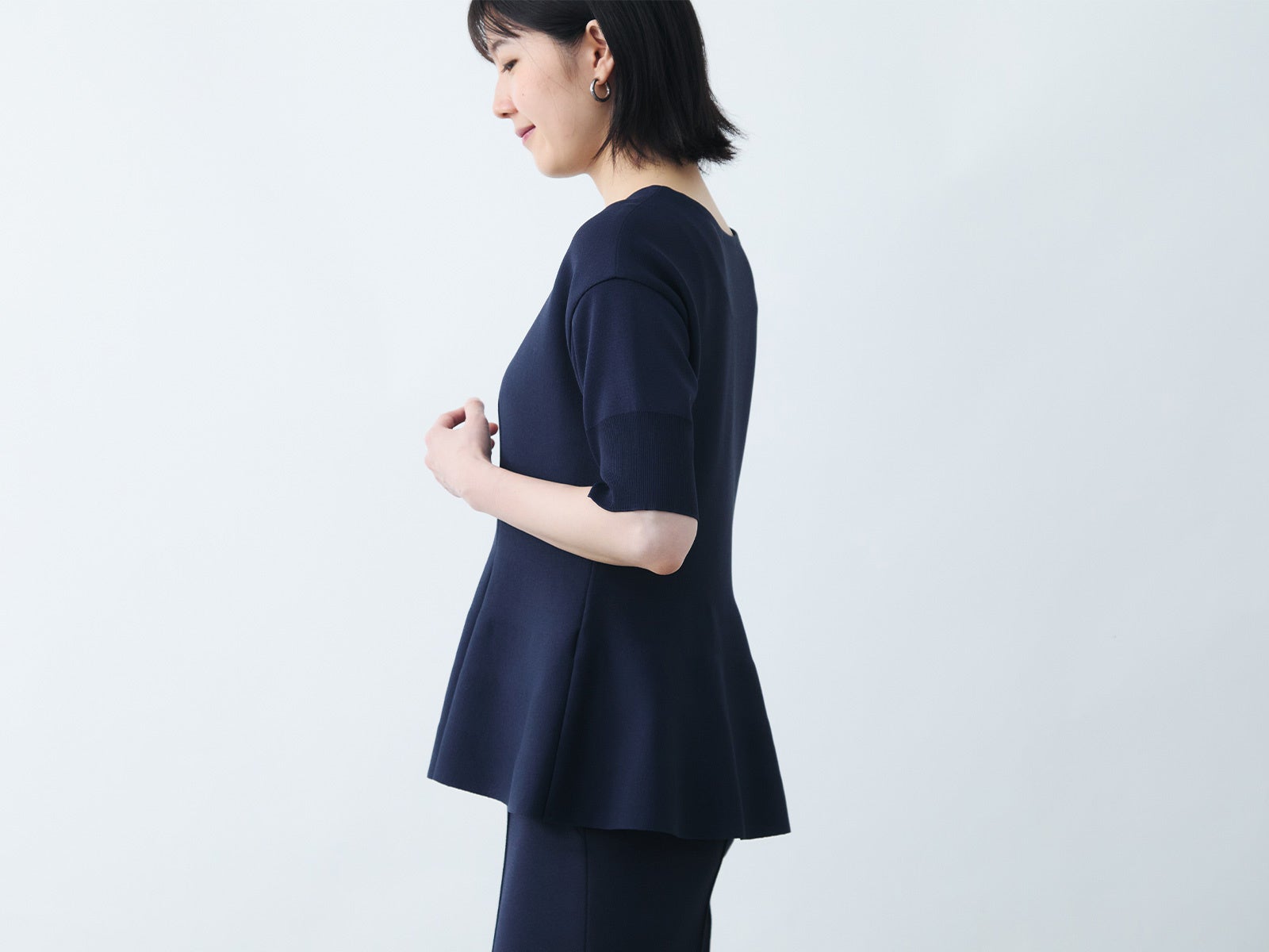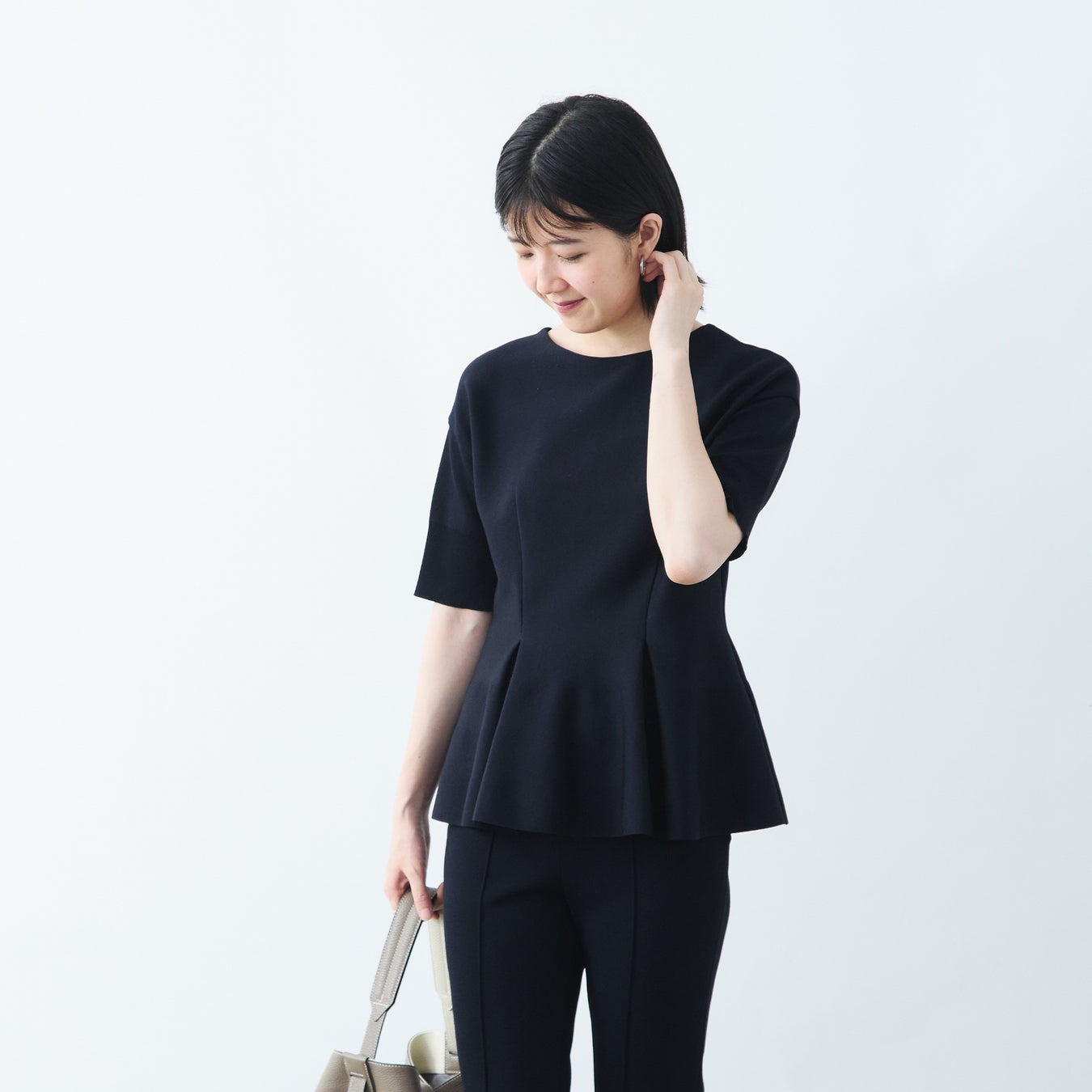 きれいめに着られるペプラムのトップスは、ブラウスのように布帛(織物)で作られているものが多くありますが、今回のトップスはニット(編み物)で作られているというのが大きなポイント。