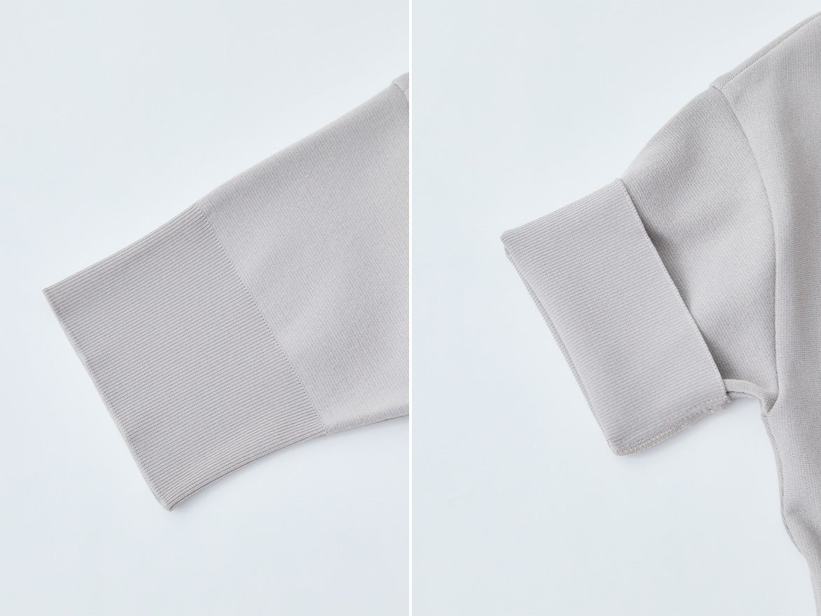 この製品では上品さを出すために弊社のストレッチ糸の光沢を活かしたミラノリブの生地を使用しています。