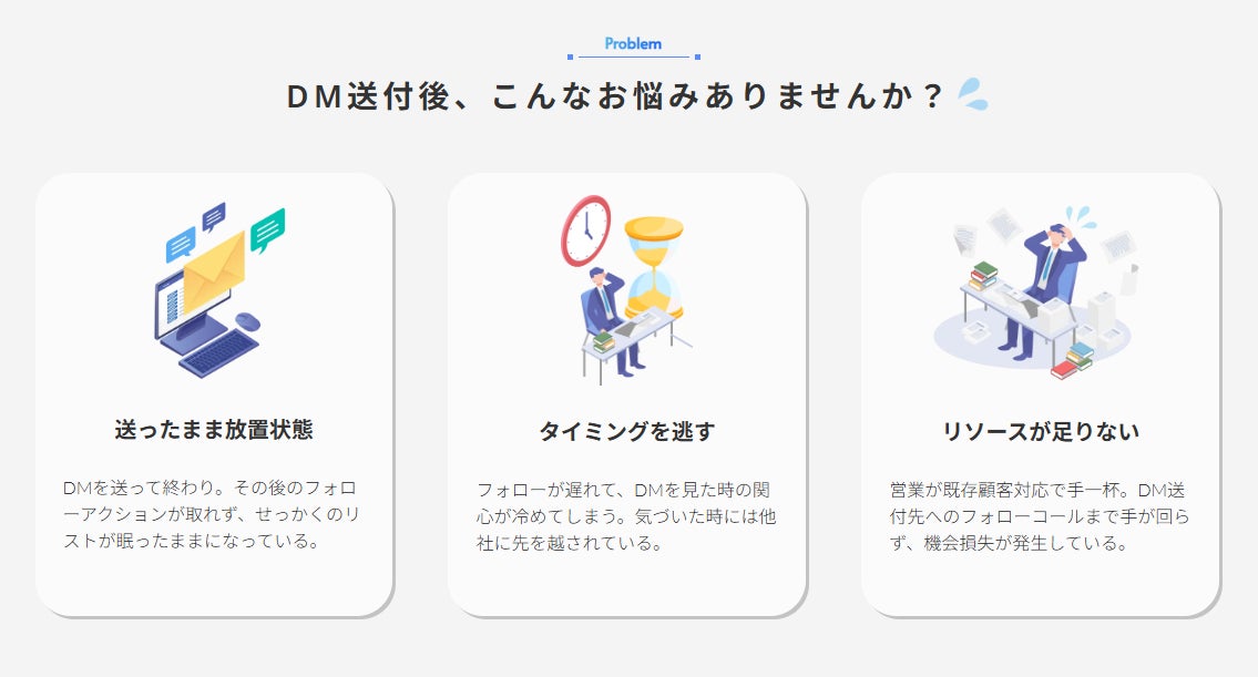 といった相談が増えており、DM送付後の接点づくりやフォローコールの流れを見直したい企業が多い現状を踏まえ、支援体制を強化しました。