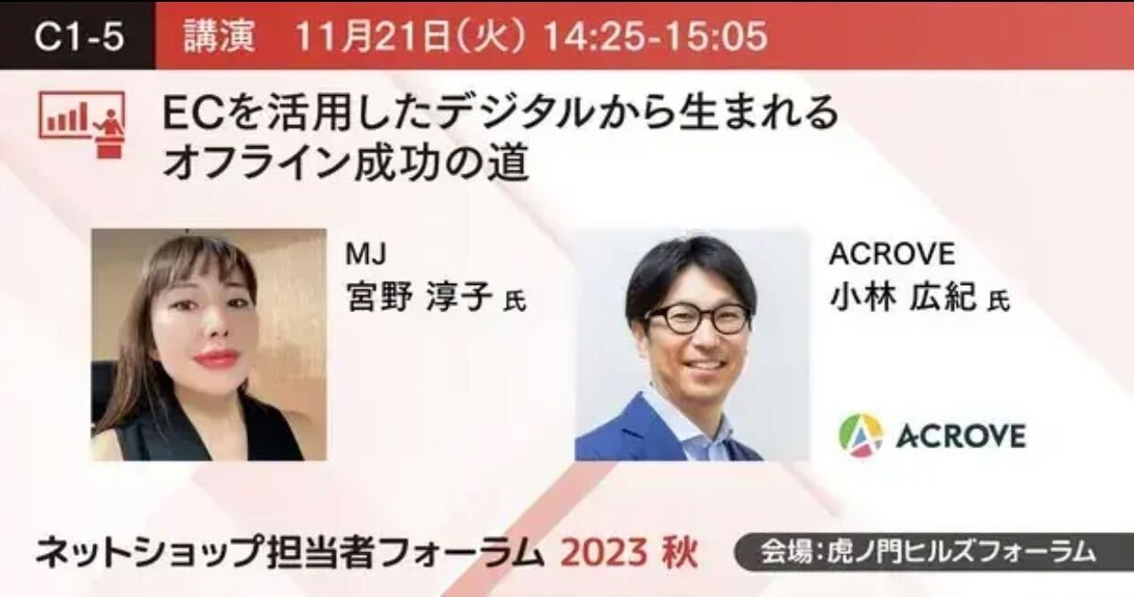 EC売上最大化を実現するECプラットフォーム事業と、M&Aを通してブランド育成を図るECロールアップの2事業を展開する株式会社ACROVE(本社:東京都千代田区、代表取締役:荒井 俊亮、以下ACROVE)は、)は、2023年11月21日(火)、22日(水)の2日間に渡って開催される株式会社インプレス主催の「ネットショップ担当者フォーラム 2023 秋」に登壇いたします。