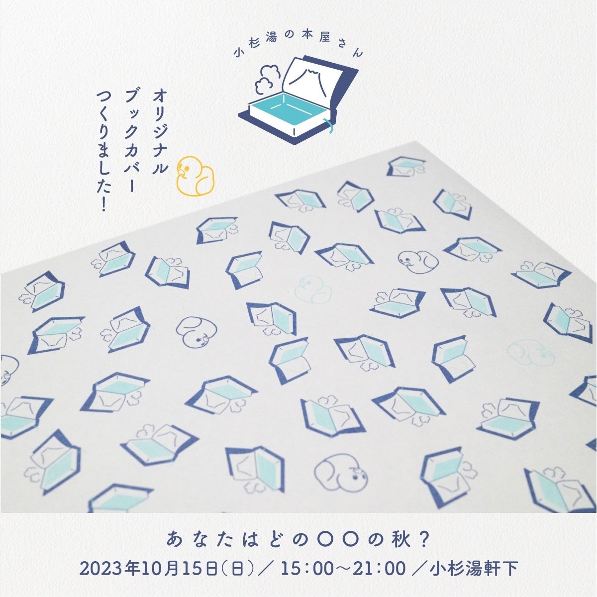 今回の販売では「秋」にちなんだ4つのテーマ「食欲」「読書」「運動」「芸術」にまつわる素敵な本を揃えました。購入者には、本と銭湯をつなぐイメージのオリジナルブックカバーをプレゼント。こちらのブックカバーのデザインは、小杉湯の本屋さんメンバーで、「紙作室そえがき」のりんみさんが担当。