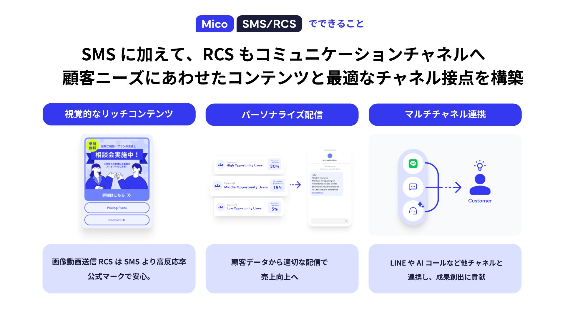 「Mico SMS/RCS」は、電話番号を起点に、高い到達率を誇るSMS(ショートメッセージサービス)と、画像や動画などのリッチコンテンツを送付可能なRCS(リッチコミュニケーションサービス)を活用し、企業と顧客のコミュニケーションをサポートします。
