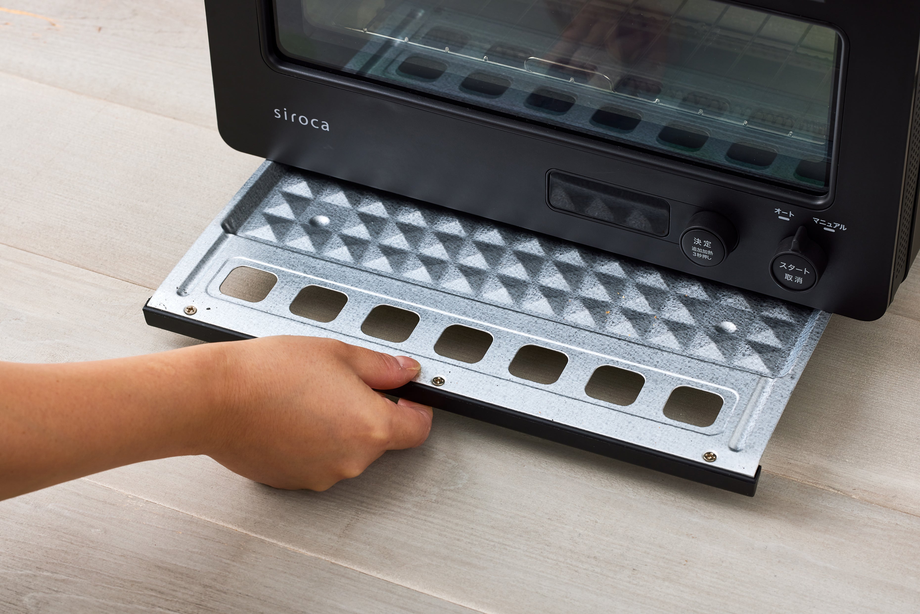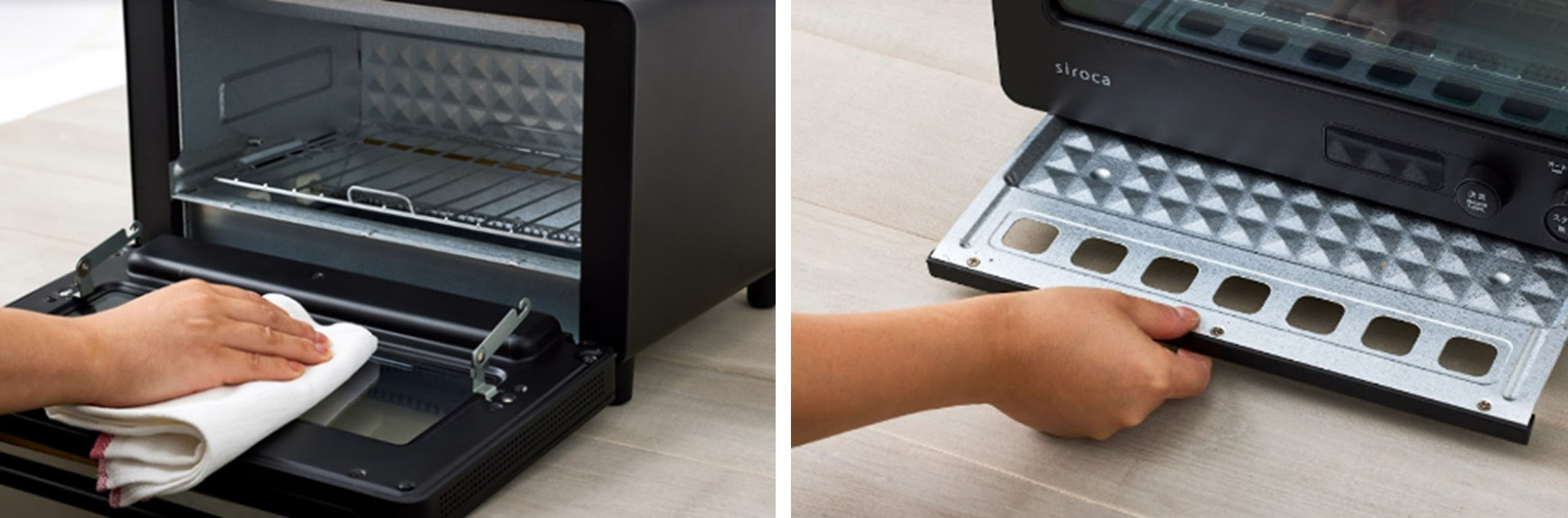 焼き網を取り外せば扉が90度開閉するため、お手入れも簡単。パンくずトレーは取り外して手軽に洗えるので、いつでも清潔にお使いいただけます。様々な料理に活用していただきたいからこそ、お手入れのしやすさにもこだわりました。
