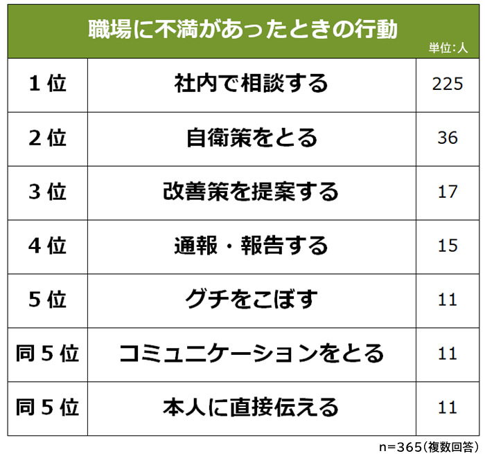 不満に対して行動を起こした365名に「職場に不満があるときにとった行動」を聞いたところ、1位は「社内で相談する(225人)」でした。