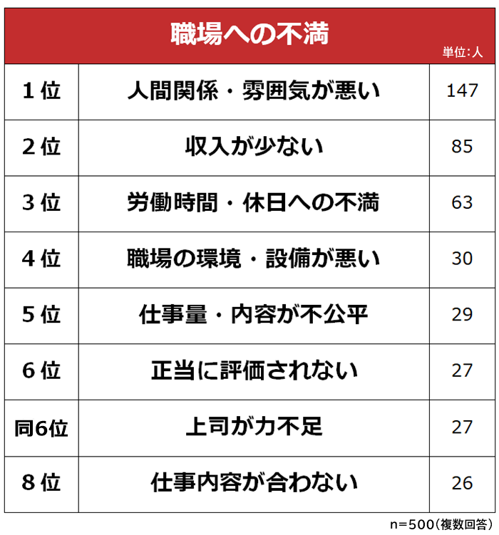 働く男女500名に「職場への不満」を聞いたところ、1位は「人間関係・雰囲気が悪い(147人)」でした。