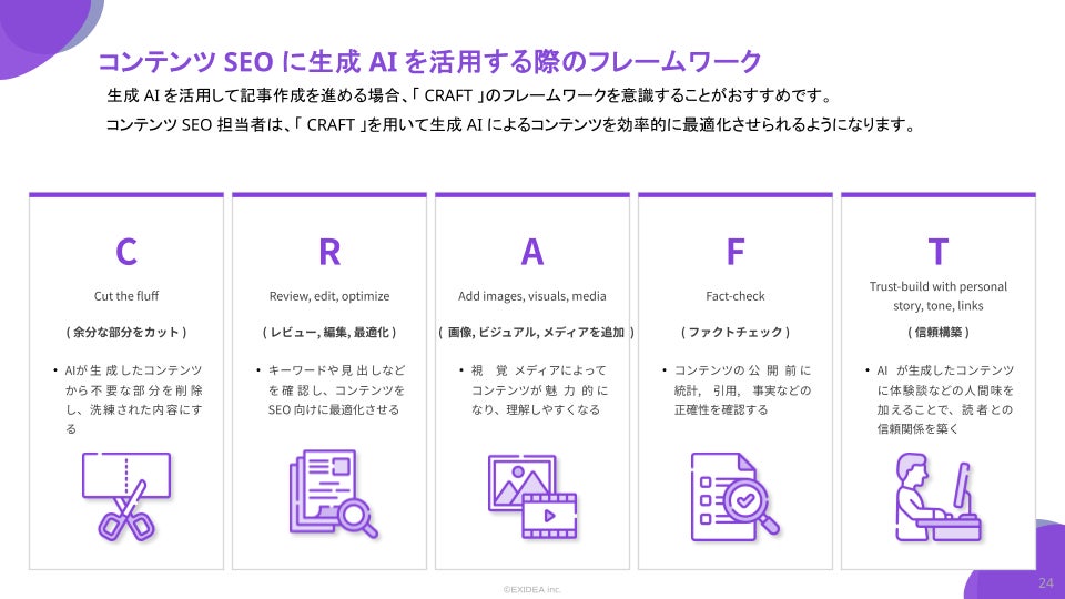 ファネルチェック機能を利用することで、CRAFTというコンテンツ作成における生成AI活用のフレームワーク部分もサポートしております。SEOに最適なコンテンツ作成や、業務効率の向上を目指しています。