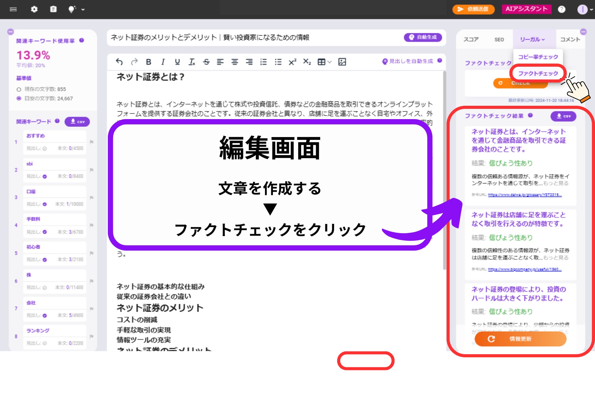 生成AIやEmmaToolsで生成した記事、もしくはライターが書いた記事を編集画面に読み込ませた後に「ファクトチェック」ボタンをクリックすれば、EmmaToolsが信ぴょう性を判断します。