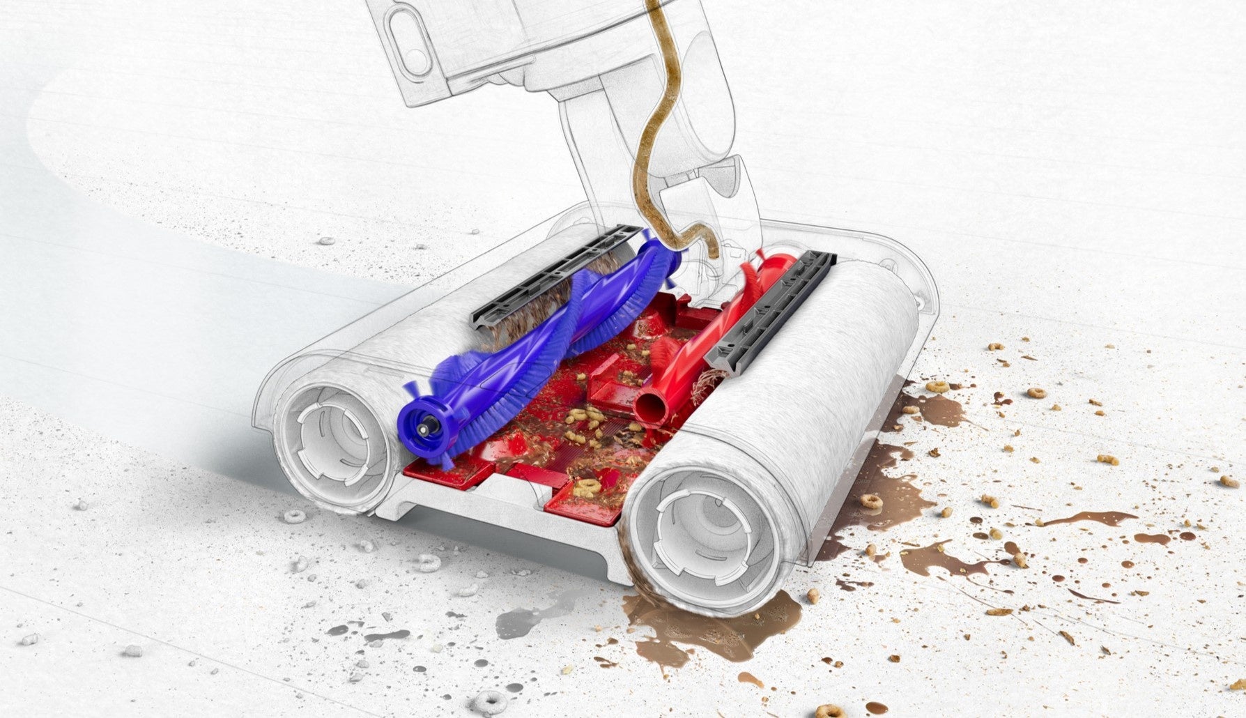 Dyson WashG1™には、2つの逆回転するウェットローラーが搭載されています。1ストロークで汚れに2回アプローチでき、より効率的な水拭きを実現しました。また、Dyson WashG1™は吸引式ではなく、それぞれのローラーが毎分250回転することでパワフルな掃除性能を発揮します。そのため、排気口から不快な臭いが排出されることもありません。
