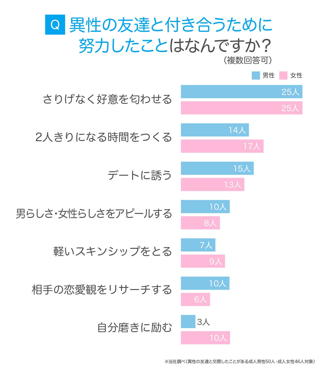 異性の友達と交際経験がある成人男女に、付き合うために努力したことを聞いたところ、「さりげなく好意を匂わせる」が最多回答でした。