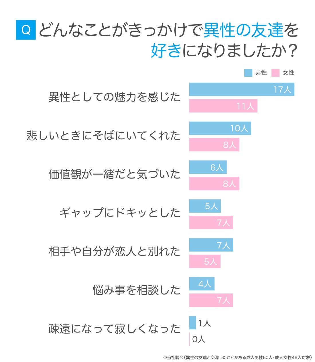 続いて、異性の友達と交際経験のある成人男女96人に、好きになったきっかけを聞いてみました。