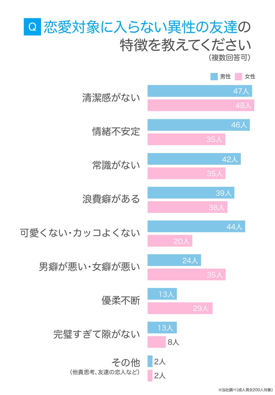成人男女200人に、恋愛対象に入らない異性の友達の特徴を聞いたところ、「清潔感がない」と「情緒不安定」が上位にランクインしました。