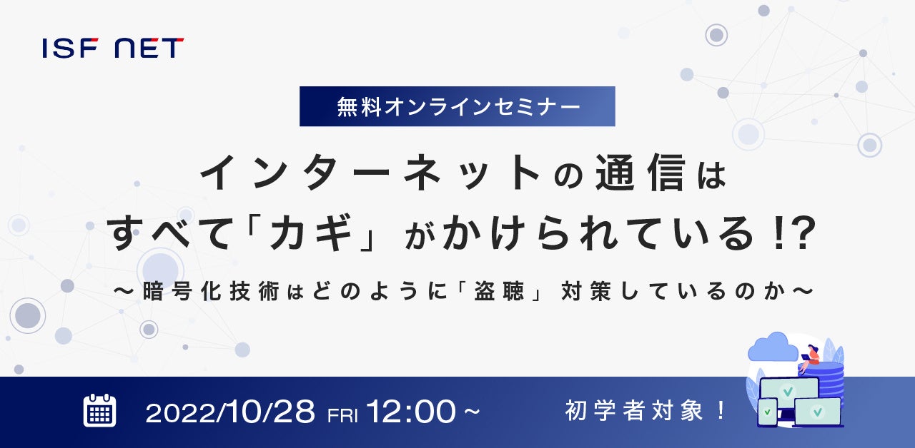 株式会社アイエスエフネット(本社:東京都港区、代表取締役:渡邉幸義)は、10月28日(金)の日程にて、無料セミナー「インターネットの通信は、すべて『カギ』がかけられている?!~暗号化技術はどのように「盗聴」対策しているのか~」を開催いたします。