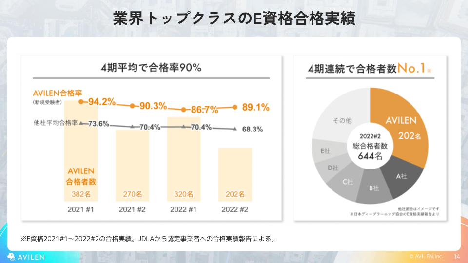 AVILEN、4期連続でE資格合格者数No.1を達成!2022#2は202名、新規受験者(※1)の合格率は89%